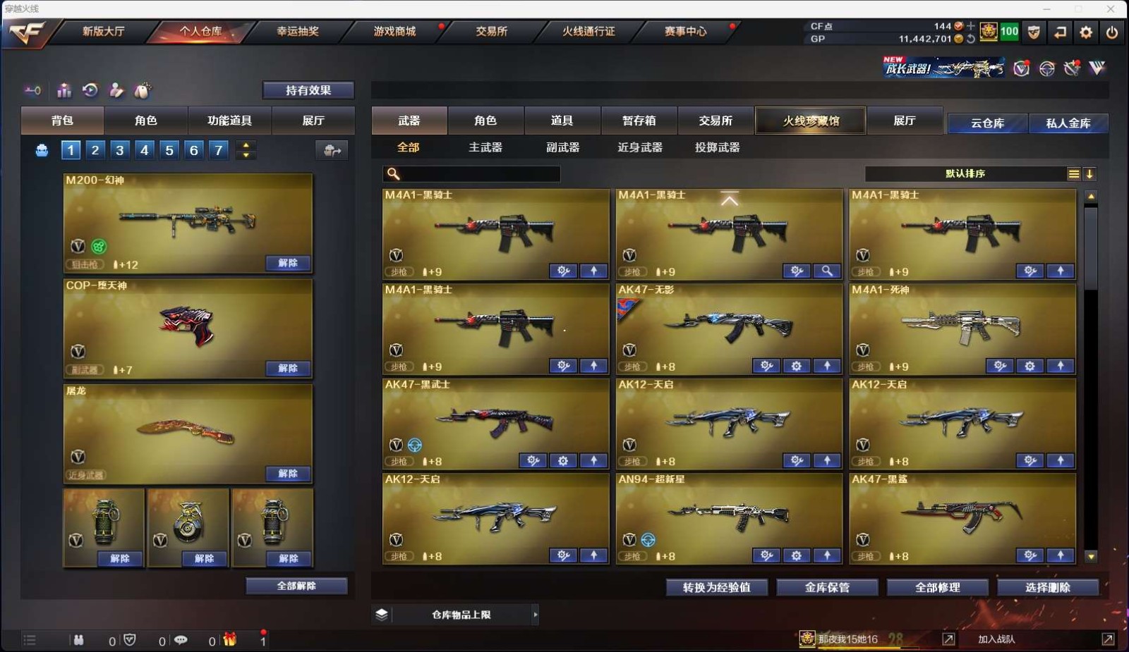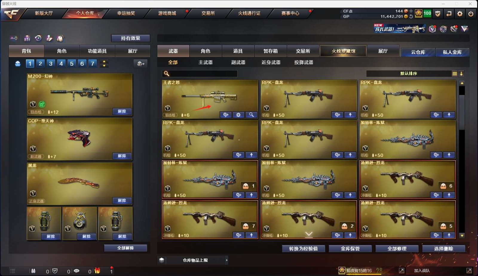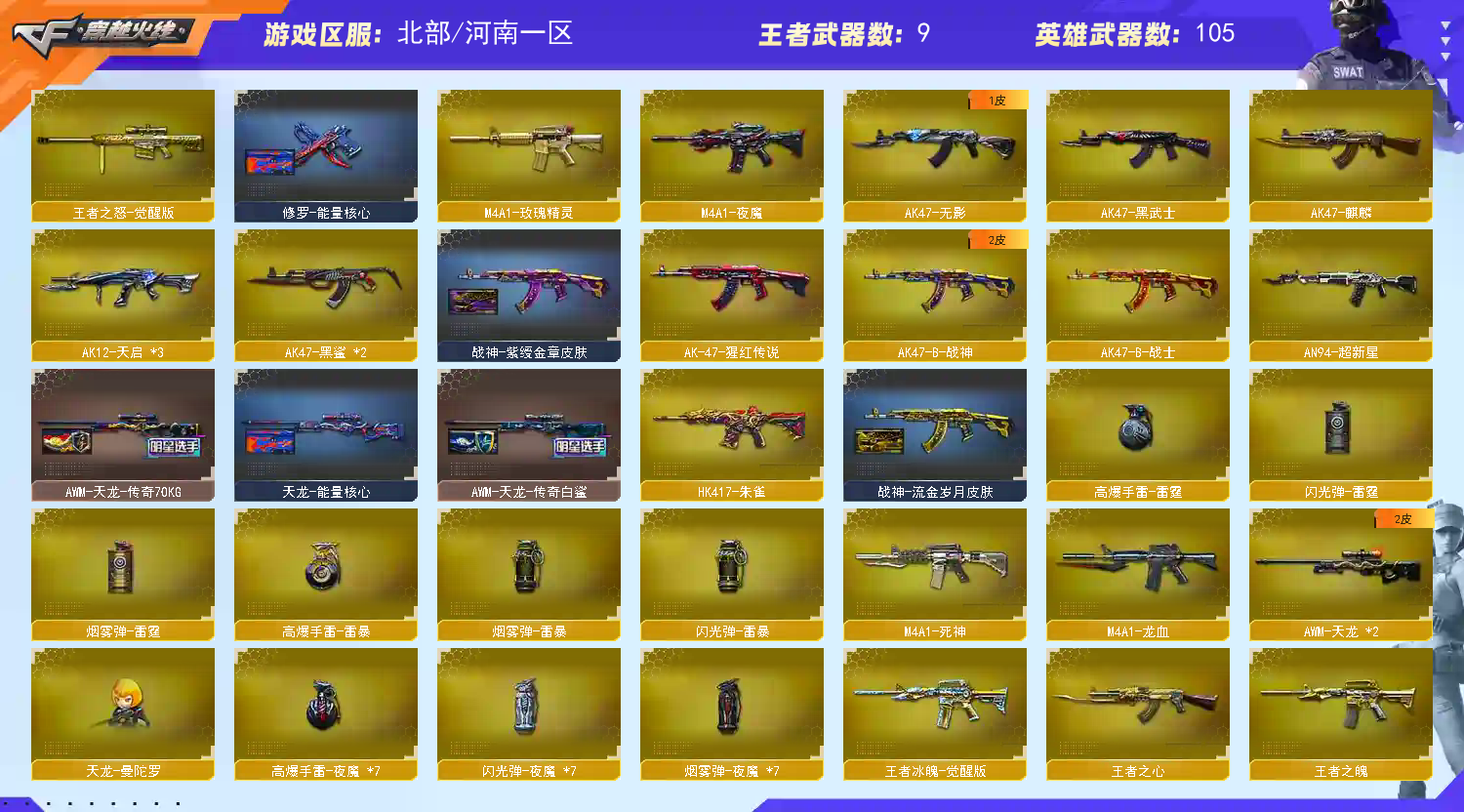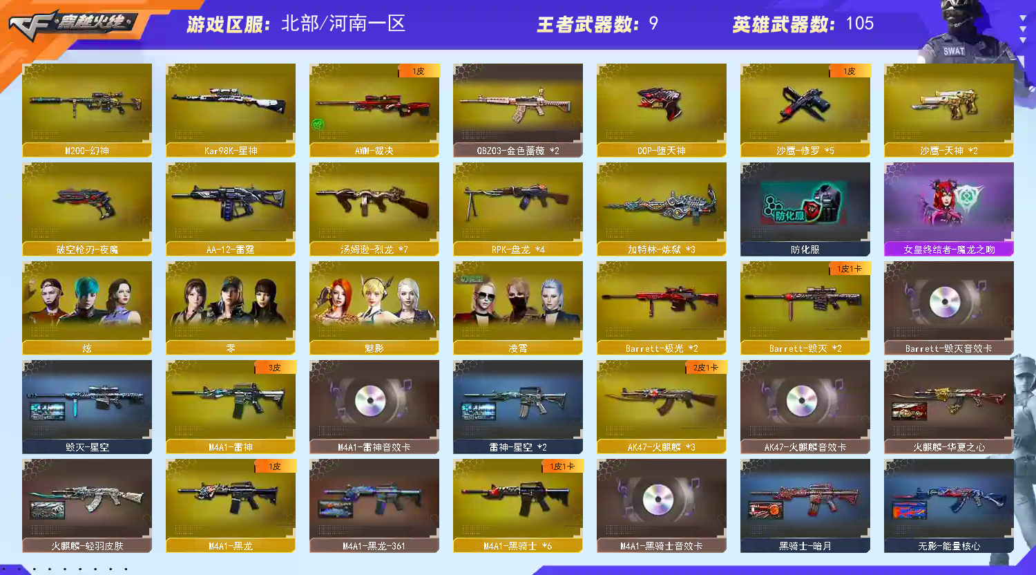 【m200幻神】【98k星神】【qbz03金色蔷薇】【7烈龙+3炼狱+4盘龙+死亡之眼】【6黑骑士】【夜魔套装】【雷神+雷神音效卡】【火麒麟+火麒麟音效卡】【毁灭+毁灭音效卡】【黑骑士+黑骑士音效卡】【王者冰魄 王者之魄 王者之心 王者之翼 王者之光 王者之怒】【烈火 天启 战神 黑鲨 黑龙 无影 黑龙 玫瑰精灵 死神 龙血 朱雀 黑鲨 超新星 天龙 极光 裁决 】——【热门武器/小人呛】【雷神精英刀锋 天龙曼陀罗 cat 金色小号 m37葵 】——【cop堕天神 破空呛刃夜魔 天神 修罗*5】——【龙啸 马来剑夜魔 尼泊尔雷霆 麒麟刺 擎天 屠龙 王者之啸 斩神刀雷暴】——【雷暴投掷武器套装+雷霆投掷武器套装+夜魔投掷武器套装*7】——【角色】【凌霄 魅影 零 炫】;RPK-盘龙,QBZ03-金色蔷薇,M200-幻神,Kar98K-星神,