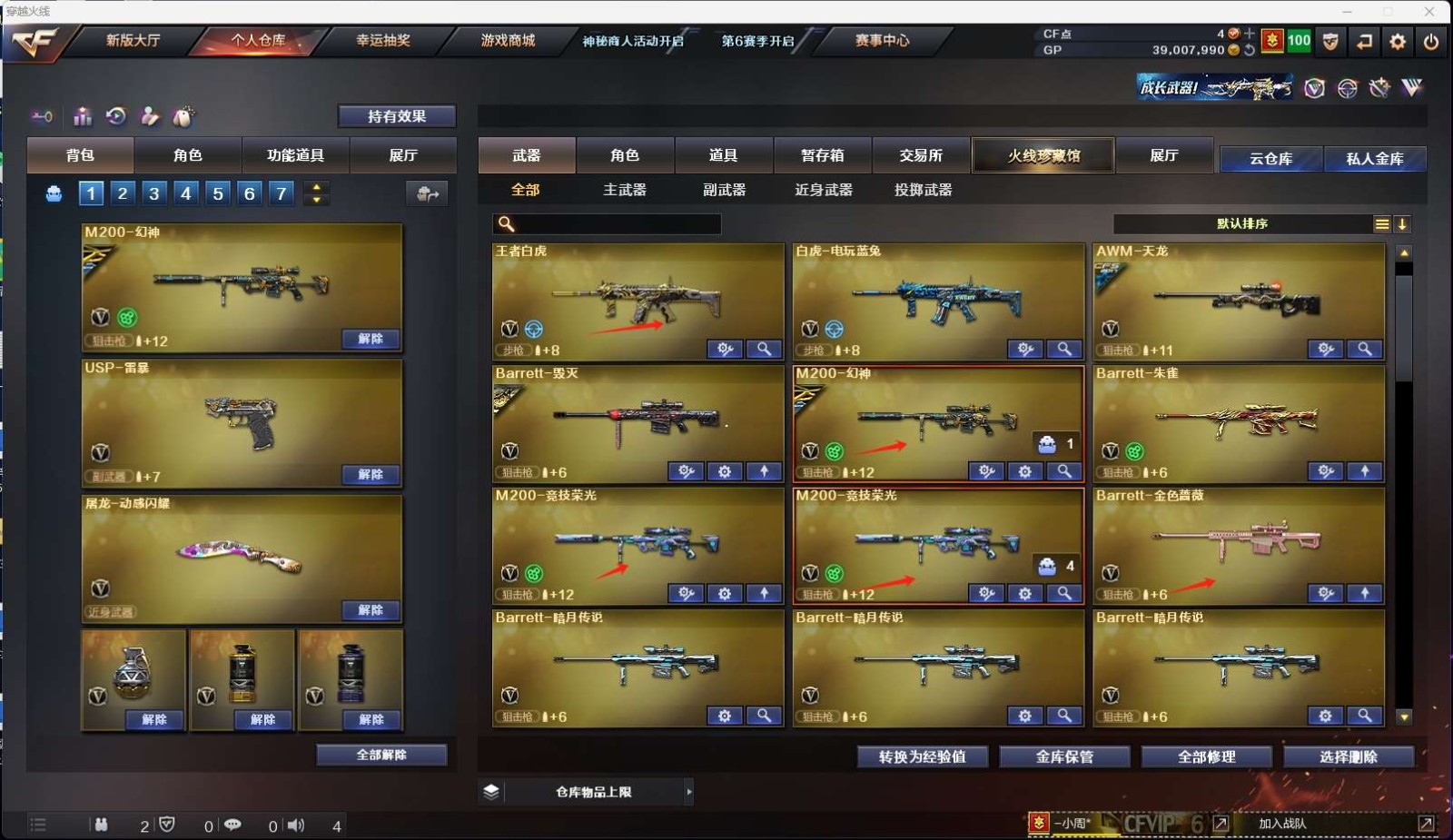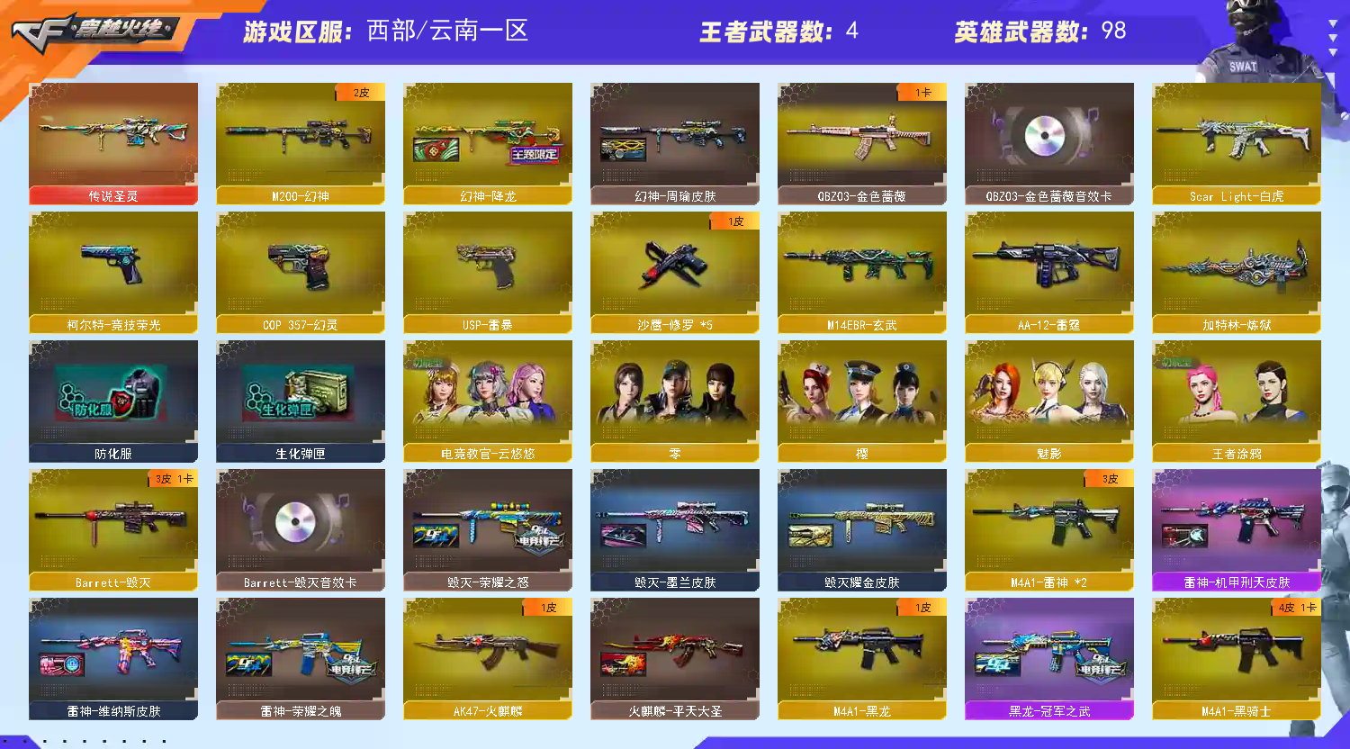 【m200幻神+周瑜皮肤+降龙皮肤+usp雷暴】【m200竞技荣光*2套装*1+电竞教官云悠悠】【传说圣灵】【幻灵套装】【白虎 王者白虎】【qbz03金色蔷薇+qbz03金色蔷薇音效卡+芭蕾特金色蔷薇】【朱雀 芭蕾特朱雀 玄武】【毁灭+毁灭音效卡+荣耀之怒皮肤】【雷神+荣耀之魄皮肤】【黑龙+冠军之武皮肤】【黑骑士+黑骑士音效卡+冠军之势皮肤】【王者之武 王者之决】【千变 火麒麟 无影 死神 无影神兵利器 烈火动感闪耀 玫瑰精灵 猩红传说 战神 黑骑士海王 常胜将军 白虎电玩蓝兔 天龙 暗月传说 炼狱 aa12雷霆】——【热门武器/小人呛】【天龙曼陀罗 awm灵狐15周年嘉年华 金刚伞 金刚伞电玩红兔 】——【usp雷暴 沙鹰修罗 cop357幻灵 柯尔特竞技荣光 天神动感闪耀】——【屠龙 擎天 麒麟刺 幻灵之锋 擎天竞技荣光 屠龙动感闪耀 龙啸热带奇洋】——【竞技荣光投掷武器套装*7+幻灵投掷武器套装*3】——【角色】【4防王者涂鸦】【电竞教官云悠悠】【魅影】【樱】【零】【乔伊教练】;USP-雷暴,电竞教官-云悠悠,QBZ03-金色蔷薇,M200-幻神,Scar Light-白虎,
