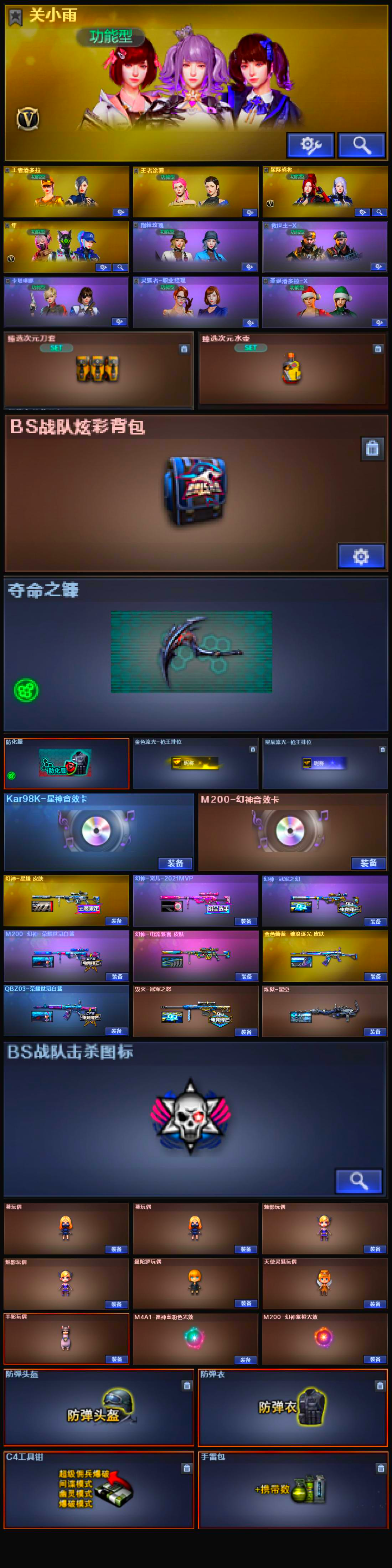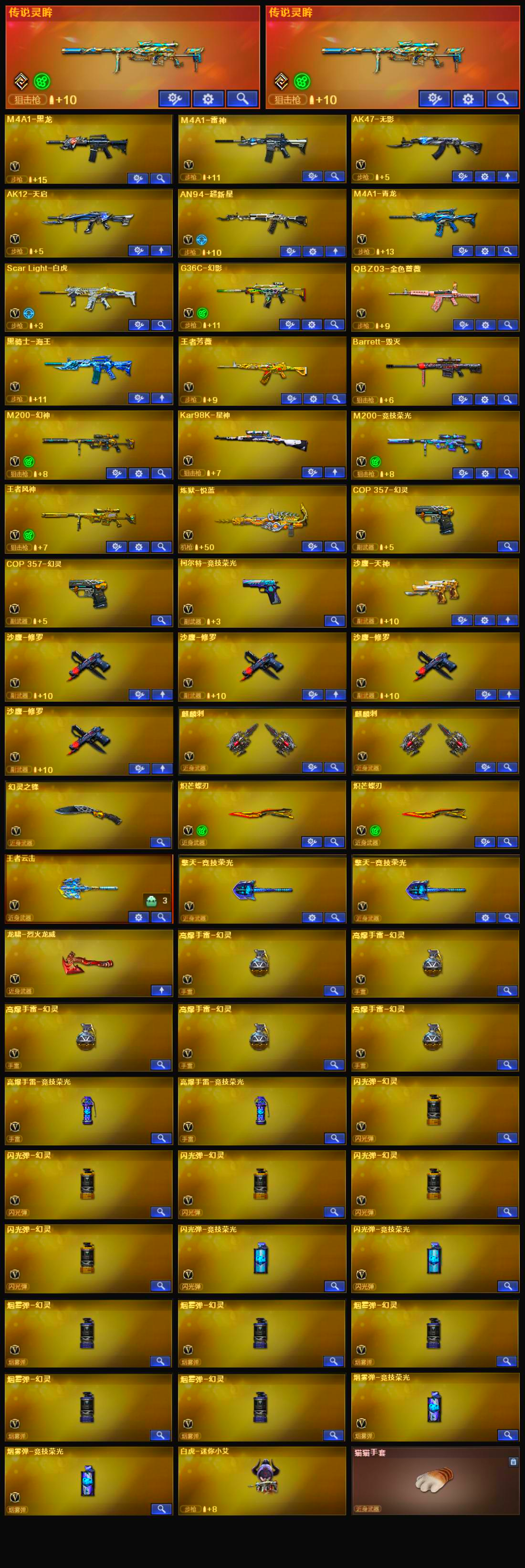 【幻神5皮三件套!!!】【双传说灵眸!!!】【传说灵眸*2】【m200幻神+m200幻神音效卡+宠儿皮肤+荣耀世冠白鲨皮肤+冠军之幻皮肤+星耀皮肤+电流骇客皮肤+王者风神+炽芒蝶刃*2】【m200竞技荣光套装】【98k星神+98k星神音效卡】【白虎】【g36c幻影+破浪逐光皮肤】【qbz03金色蔷薇+破浪逐光皮肤+荣耀世冠白鲨皮肤】【毁灭+冠军之怒皮肤】【王者芳薇】【黑龙 雷神 无影 天启 超新星 青龙 炼狱悦蓝】——【热门武器/小人呛】【白虎迷你小艾 cop白鲨】——【修罗*4 天神 cop幻灵*2 柯尔特竞技荣光】——【炽芒蝶刃*2 麒麟刺*2 幻灵之锋 擎天竞技荣光*2 王者云击 龙啸烈火龙威】——【幻灵投掷物套装*5 竞技荣光投掷物套装*2】——【角色】【4防王者潘多拉】【4防职业经理】【关小雨 星际战将 隼】【王者涂鸦】;炽芒蝶刃,隼,QBZ03-金色蔷薇,G36C-幻影,M200-幻神,Scar Light-白虎,传说灵眸,
