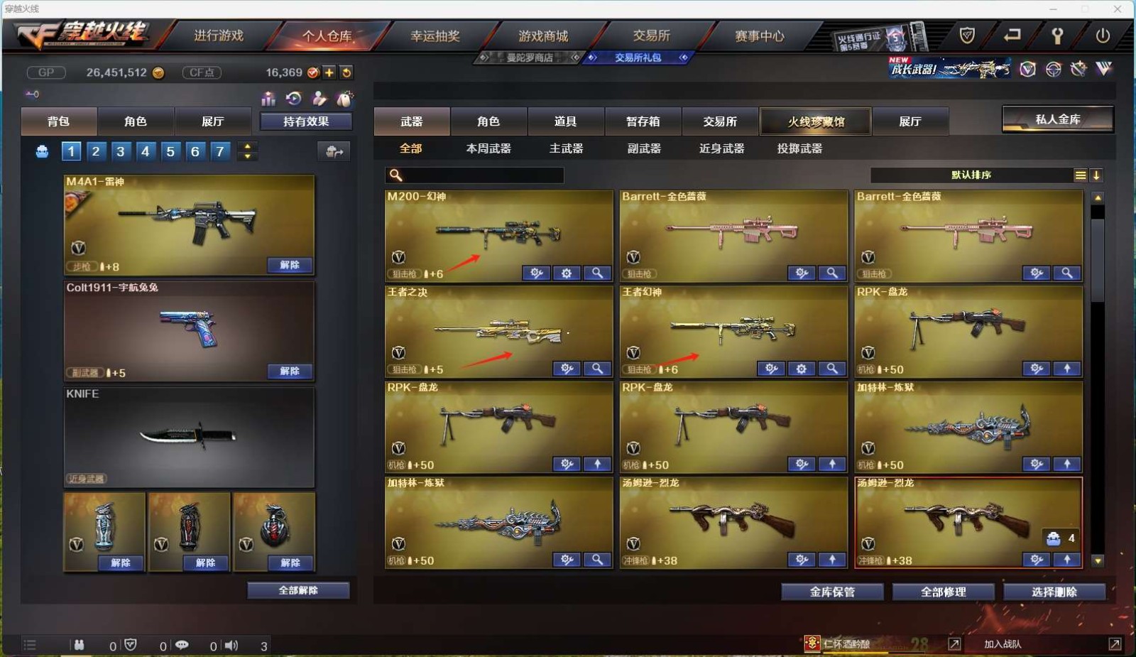 【m200幻神+王者幻神】【qbz03金色蔷薇+芭蕾特金色蔷薇 】【6烈龙+3盘龙+2炼狱+死亡之眼】【网剧冠军套装】【m4a1夜魔】【hk417朱雀】【火麒麟+火麒麟音效卡】【毁灭+毁灭音效卡】【雷神+雷神音效卡】【王者之城 王者之翼 王者之戮 王者之势 王者之决 王者之怒】【烈火 天启 黑鲨 黑武士 无影 黑骑士 猎神 千变 死神 武圣 裁决 天龙 极光 aa12雷霆】——【热门武器/小人呛】【雷神精英刀锋 火麒麟灵狐 】——【修罗*3 天神 王者之魂 王者之灵 修罗网剧冠军 武圣手呛】——【龙啸 马来剑夜魔 麒麟刺 擎天 屠龙 擎天网剧冠军】——【夜魔投掷武器套装*3】——【零 葵 审判者 曈 樱】【修道士】;RPK-盘龙,QBZ03-金色蔷薇,M200-幻神,