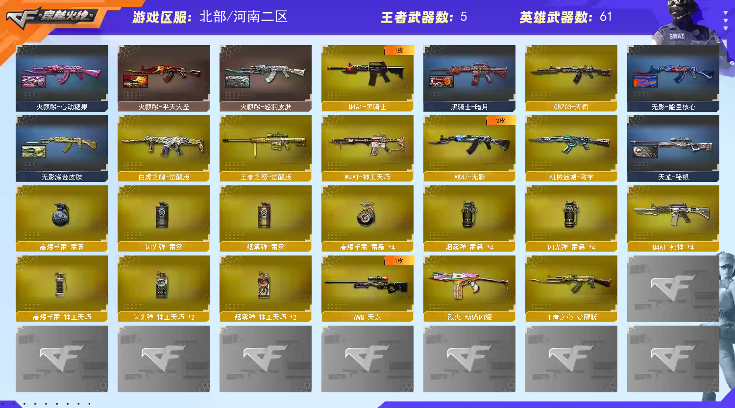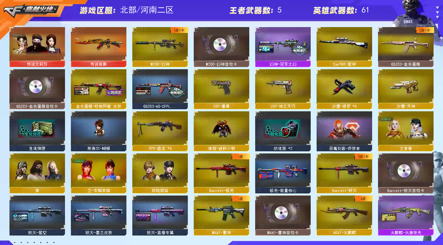 ★收藏好评! 由于异地登录保护机制,部分客户在使用客户端自动上时会出现密码错误,注意本号密码不会错误,请多尝试5-6次!本账号已经过虚拟财产,请各位科技大神高抬贵手。请素质租号,文明游戏,谢谢大家配合!!!;USP-雷暴,传说艾莉莎,RPK-盘龙,QBZ03-金色蔷薇,M200-幻神,Kar98K-星神,