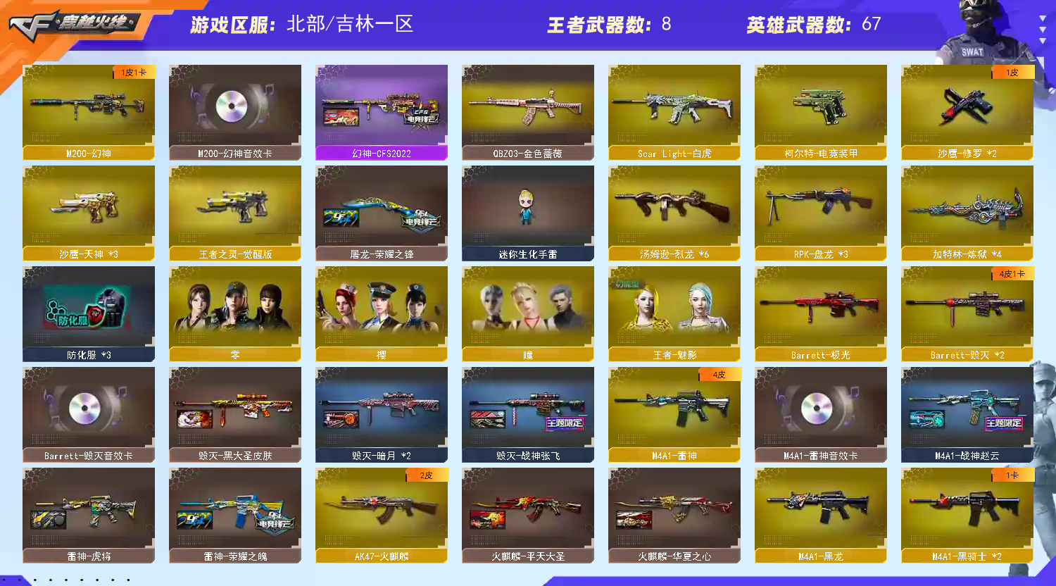 首页 > 租号大厅 > 穿越火线 > 网通区/吉林一区 > M200幻神CFS2022皮肤幻神音效卡朱雀白虎王者蔷薇六烈龙四防角色幻神三套