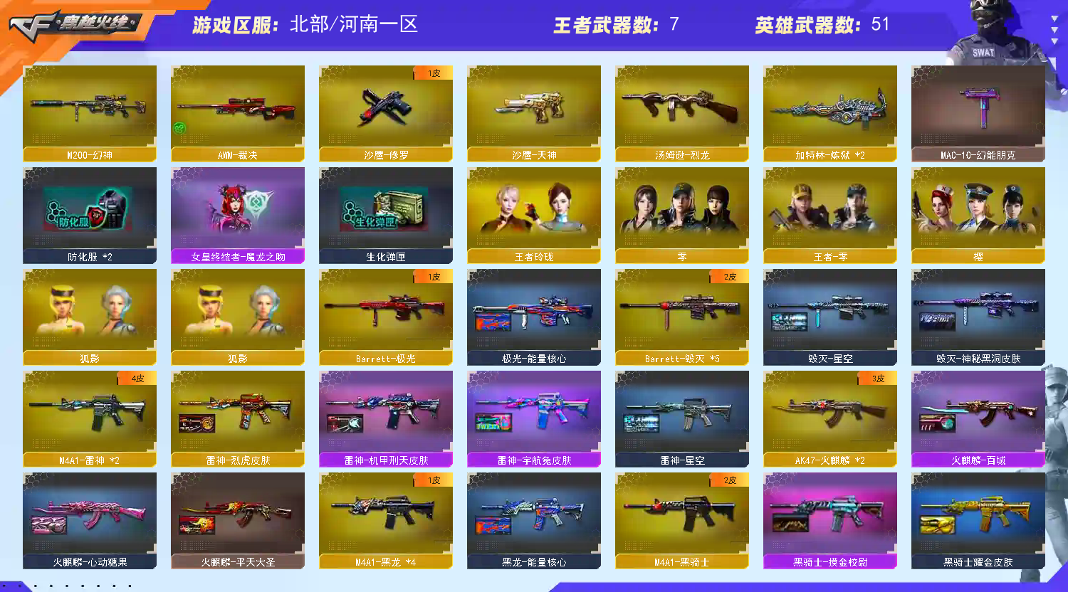 【主武器】火麒麟*2 黑龙*4 雷神*2 黑骑士 死神*2 天启*2 超新星 黑鲨 朱雀 无影神兵利器 玫瑰精灵 王者之武 猩红传说*2 战士 天龙 毁灭*6 极光 裁决 幻神 金色蔷薇大炮 炼狱*2 烈龙 M4赤狱骑士 M4十二生肖龙雷神 M4英雄能量核心 大圣御雷神 黑骑士摸金校尉*2 魂雷神萌杀 魂死神机甲刑天 魂QBZ03-金色蔷薇萌杀 御黑骑士摸金校尉 魂火麒麟百城 魂雷神15周年嘉年华 魂雷神维纳斯 魂龙血锋芒破茧 火麒麟雷神 雷神赛博朋克 王者之戮 王者之势 御黑骑士白马银枪 御黑武士烈虎 御火麒麟平天大圣 御雷神葫芦兄弟 御雷神机甲刑天 御雷神小白龙 御千变孔明 源超新星 源火麒麟 源雷神*2 源天启*2 源黑武士 源黑骑士 源机械迷城 源猎神 源玫瑰精灵 源千变 加特林炼狱掌火 御炼狱女娲 VEPR12-金鹰 【副武器】修罗 天神 魂修罗15周年嘉年华 修罗摸金校尉*2 修罗年鹏 源天神*3 大黄蜂 二次元 小白龙 宇航兔兔 【近战武器】屠龙*4 龙啸 擎天*2 麒麟刺 魂屠龙都是CFER 源擎天 源龙啸 源擎天萌杀*2 源屠龙 迷你波特博士 【投掷武器】竞技荣光套*2 闪光弹雷霆王者 音乐手雷 惨叫鸡 高爆雷蛇 机械手雷 【角色】零 樱 狐影 王者零 王者玲珑 三防角色N个 【道具】雷神烈虎皮肤 黑骑士摸金校尉 雷神机甲刑天皮肤 火麒麟百城 雷神宇航兔兔 雷神星空 毁灭星空 黑骑士耀金皮肤 火麒麟AG战队皮肤;M200-幻神,