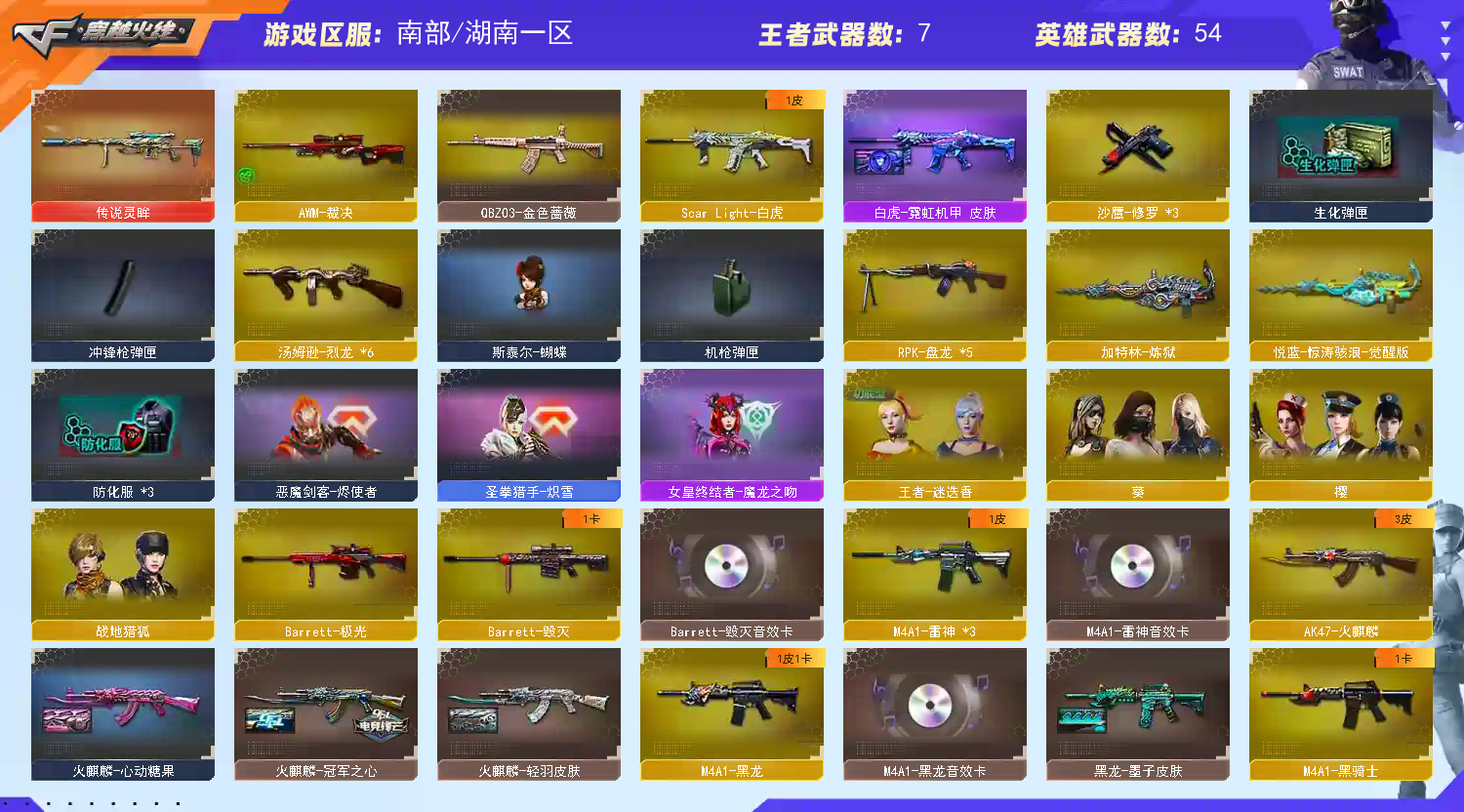 【温馨提示】此号价值数十万,已向公安机关报备,如有开G开辅助封号的,由平台提供,身份信息,证据和地址进行报警处理并依法追究责任!祝各位老板玩得开心。请使用官方启动,更快捷稳定上号。恶意下单维权及检测到外挂将无法再次下单!【温馨提示】排位比赛请勿中途退出游戏,一经发现拉黑处理。【温馨提示】如租号时长不足,请勿再开启排位或及时续租,避免禁排,如发现时长不足恶意开启排位,拉黑处理。 祝各位文明租号的租客身体健康,万事如意,玩的开;RPK-盘龙,QBZ03-金色蔷薇,Scar Light-白虎,传说灵眸,