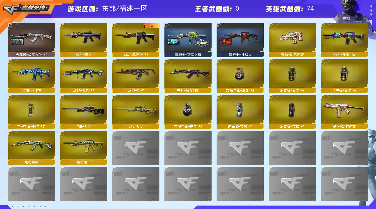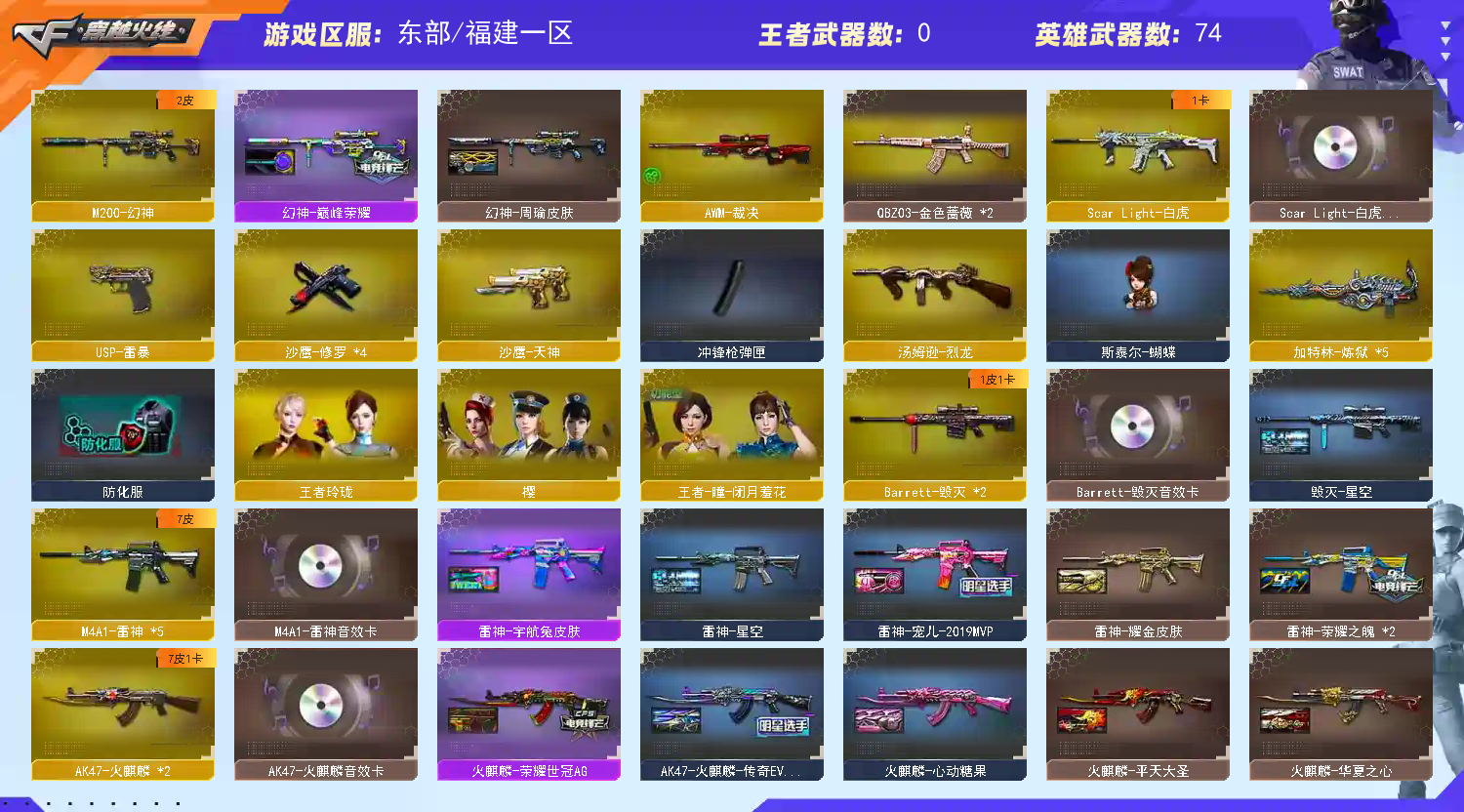 【幻神+幻神周瑜+幻神巅峰荣耀】【usp雷暴】【白虎+白虎音效卡】【樱+王者瞳闭月羞花+乔伊教练满套装+王者玲珑+职业选手/绝迹语音包/n9语音包】【qbz金色蔷薇】【火麒麟荣耀世冠ag+火麒麟传奇even+黑骑士冠军之势+雷神宠儿+雷神荣耀之魄+火麒麟轻羽+雷神白鲨冠军】【毁灭音效卡+雷神音效卡+火麒麟音效卡】雷神/火麒麟/千变/黑龙/黑骑士/黑鲨/烈火/天龙/毁灭/裁决【5炼狱+烈龙+斯泰尔蝴蝶】【cop旗袍】1911大黄蜂【猫猫手套】【超级背包+虎牙炫彩背包】【工具钳手雷包】;USP-雷暴,QBZ03-金色蔷薇,M200-幻神,Scar Light-白虎,