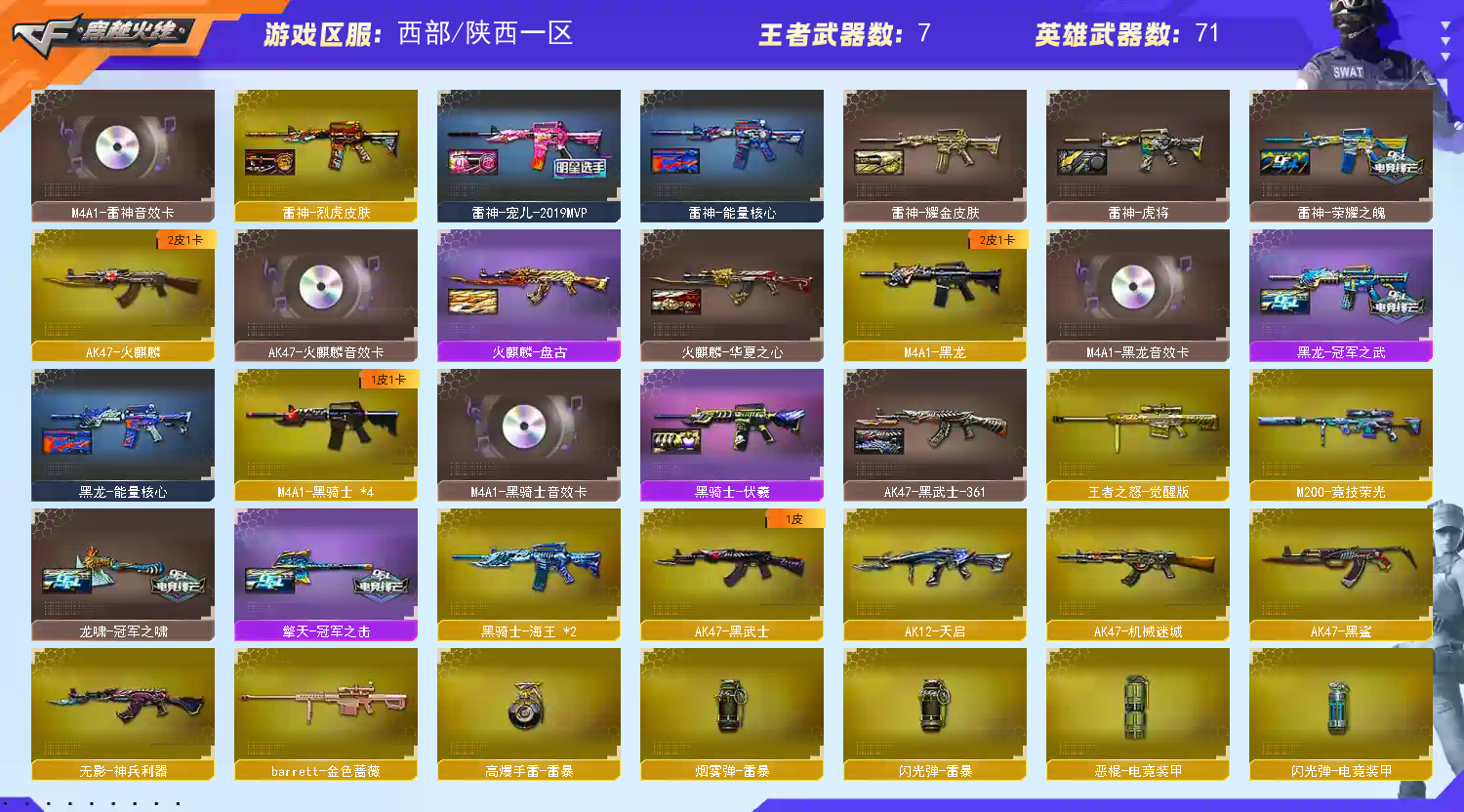 【★★传说梦魇★★】【m200-幻神带幻神-ag17冠军皮肤带幻神-丹凤皮肤】【m200-竞技荣光】【scar白虎带白虎-暗星皮肤带音效卡】【qbz金色蔷薇】【柯尔特-竞技荣光】【柯尔特-电竞装甲】【cop 357-雷霆王者】 【四防角色王者葵-惊若翩鸿】 【四防角色王者-魅影】【雷神×2带雷神宠儿皮肤带雷神-烈火皮肤带雷神-荣耀之魄皮肤带音效卡】【黑骑士×4】【barrett-金色蔷薇】【盘龙×2】【炼狱】【烈龙×2】狙击呛:【传说梦魇】【m200-幻神】【m200-竞技荣光】【裁决】【barrett-朱雀】【barrett-金色蔷薇】【天龙】【毁灭】【极光】【裁决-雪莉杨】【awm-裁决-百城联赛天津】【王者之怒】步呛:【scar白虎】【qbz金色蔷薇】【火麒麟】【雷神×2】【黑骑士×4】【黑龙】【m4a1-死神】【ak47-黑武士】【ak12-天启】【ak47-机械迷城】【ak47-黑鲨】【m4a1-龙血】【无影-神兵利器】【m4a1-猎神】【王者之心--王者之烈】【黑骑士-海王×2】机呛:【盘龙×2】【炼狱】冲锋呛:【烈龙×2】【烈龙-云海游龙】【死亡之眼】手呛:【柯尔特-竞技荣光】【柯尔特-电竞装甲】【cop 357-雷霆王者】刀具:【屠龙×2 龙啸 擎天×3 麒麟刺 斩神刀-雷暴 擎天-竞技荣光×3 擎天-云海游龙 王者之啸】手雷:【雷暴高爆手雷套 电竞装甲恶棍手雷套 竞技荣光高爆手雷套×4 云海游龙手雷套 雷霆王者高爆手雷套 雷暴闪光丹手雷套】音效卡:【scar白虎音效卡 雷神音效卡 黑龙音效卡 黑骑士音效卡 火麒麟音效卡 毁灭音效卡】角色:【四防角色王者葵-惊若翩鸿】【四防角色王者-魅影】【【云悠悠 零 樱 王者-魅影 修道士 云海玲珑】皮肤:【幻神-ag17冠军 幻神-丹凤】【雷神-烈虎 雷神-宠儿 雷神-荣耀之魄 雷神-耀金 雷神-虎将】【黑龙-冠军之武】【黑骑士-伏羲】【scar light-白虎-暗星】【龙啸-冠军之啸】【屠龙-荣耀之锋】【擎天-冠军之击】【火麒麟-盘古】【毁灭-bean-2020mvp】;电竞教官-云悠悠,RPK-盘龙,QBZ03-金色蔷薇,M200-幻神,Scar Light-白虎,