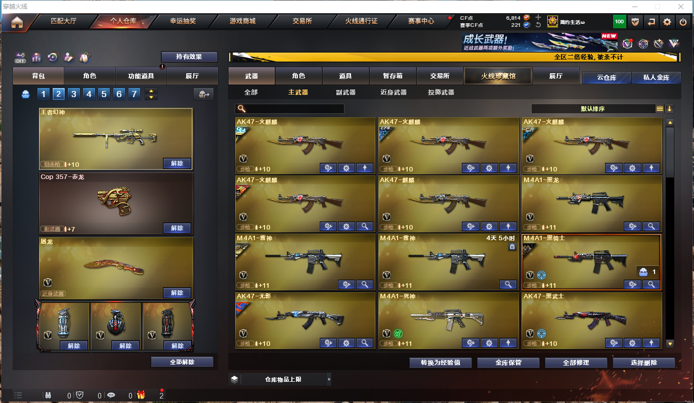 【王者幻神】【HK417-朱雀】【QBZ金色蔷薇】【裁决×3】【炼狱】【烈龙×6】【四防王者-春】狙击枪:【王者幻神】【裁决×3】【天龙×2】【毁灭】【极光】【Barrett-金色蔷薇】【天龙-曼陀罗】【王者之决--王者之力】步枪:【QBZ金色蔷薇】【HK417-朱雀】【火麒麟×4】【AK47-麒麟】【M4A1-黑龙】【雷神】【黑骑士】【AK47-无影】【M4A1-死神】【黑武士】【武圣×2】【M4A1-夜魔】【机械迷城-穹宇】【M4A1-玫瑰精灵】【王者之心--王者之魄--王者冰魄】【猩红传说×3】【M4A1-苍鸣雷神】机枪:【炼狱】冲锋枪:【烈龙×6】【烈龙-悦心】散弹枪:【AA-12-雷霆×2】手枪:【破空枪刃-夜魔 修罗-摸金校尉 炫金天神】刀具:【屠龙×5 龙啸 擎天 麒麟刺 马来剑-夜魔 王者之啸】手雷:【夜魔高爆手雷套×7 夜魔闪光弹手雷套×7 夜魔烟雾弹手雷套×7】音效卡:【黑骑士音效卡 毁灭音效卡 雷神音效卡】角色:【四防王者春】【凌霄 审判者 炫 乔伊教练】皮肤:【黑骑士-摸金校尉】【火麒麟-CFS2018 火麒麟-冠军之心】【雷神-冠军之魄】;QBZ03-金色蔷薇,