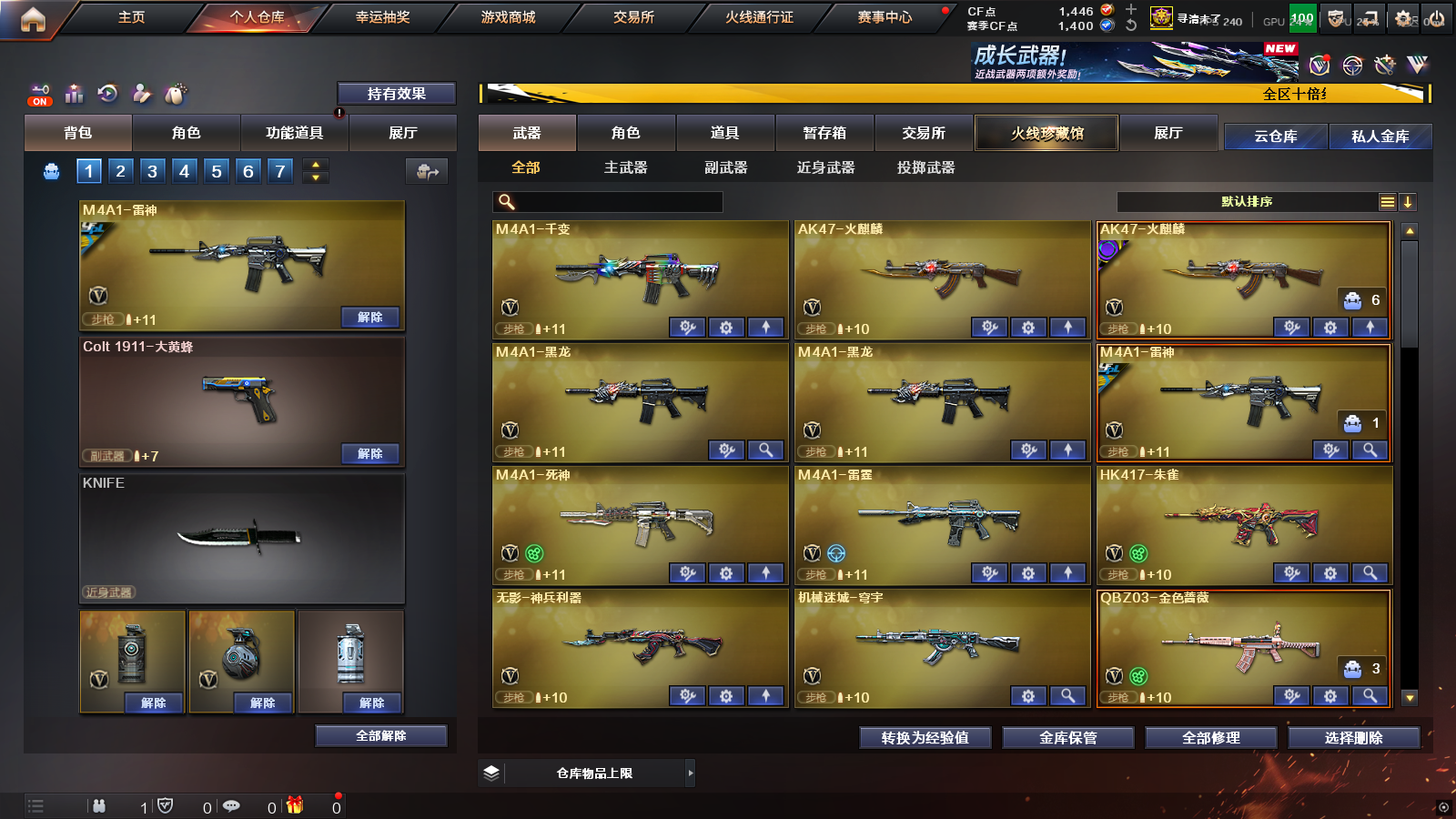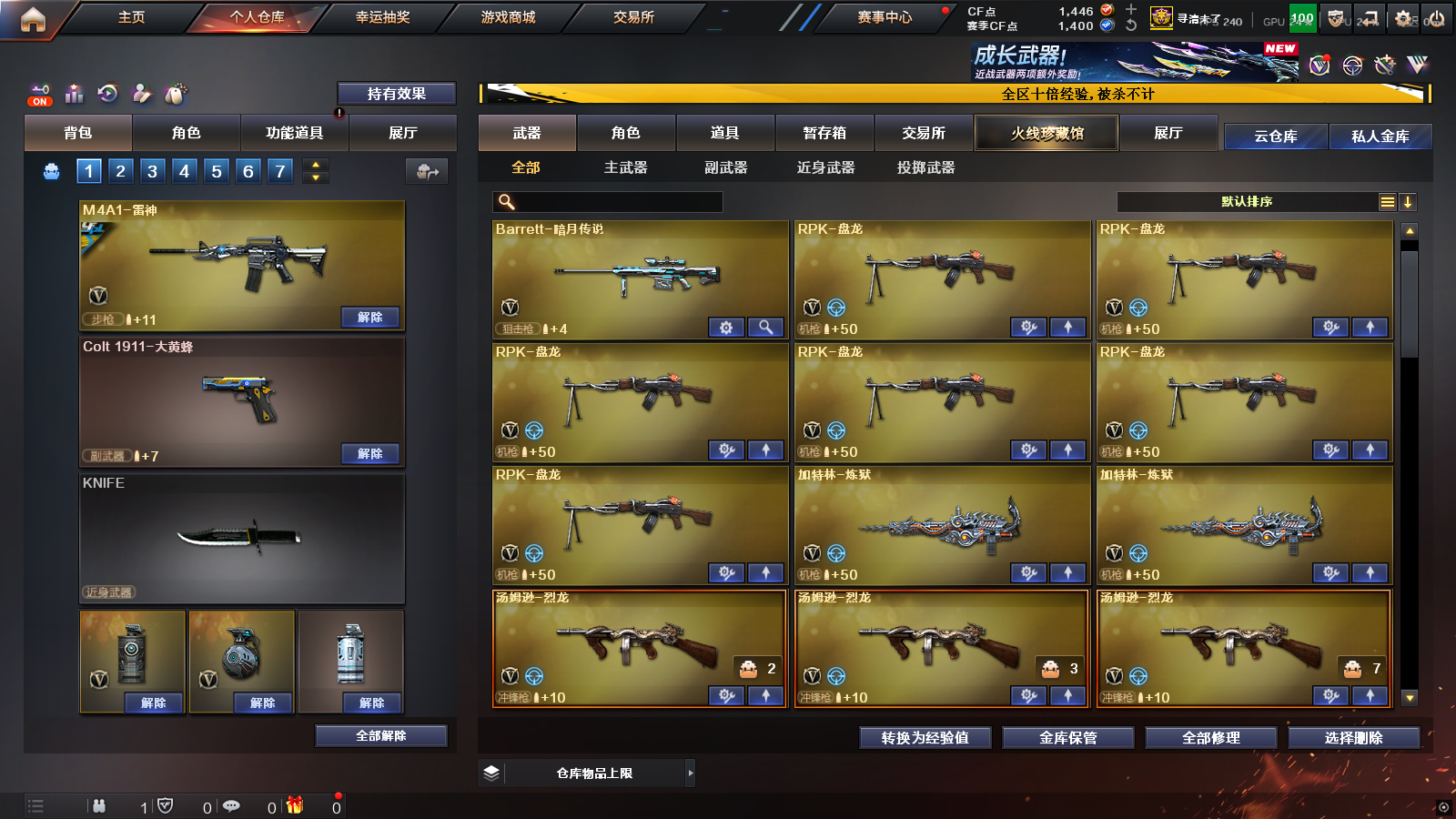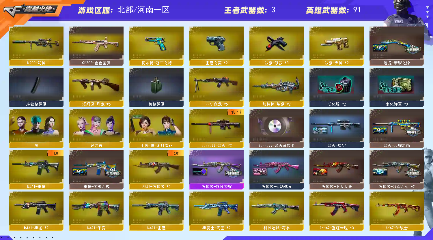 迷迭香炫、枪王之王名片X3,16年老号该有的活动道具都有、文明上号违规必究;柯尔特-冠军之特,RPK-盘龙,QBZ03-金色蔷薇,M200-幻神,