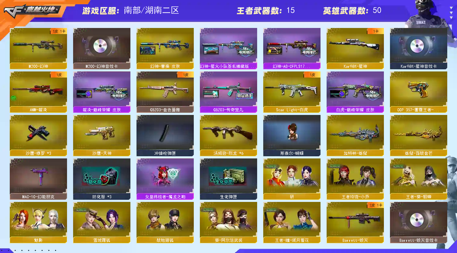 【亮点解析 幻神3皮带卡 星神带卡 生化高配 白虎带皮 裁决带皮】【m200幻神+音效卡+曹操+星火小队+ag17冠军】【98k星神+音效卡 】【6烈龙 炼狱*2 斯太尔蝴蝶 】【scar白虎+巅峰荣耀】【qbz金色蔷薇+宠儿】【hk417朱雀】【火麒麟+横秒之巅 】【黑龙】【雷神+荣耀之魄 】【黑骑士+卡+冠军之势】【毁灭+卡+sv16冠军】【裁决+巅峰荣耀】【武器:银翼 王者之心 王者火魄 荣耀世冠火麒麟 qbz王者蔷薇 】【6手枪:修罗*3 天神 雷霆王者 】【7刀具:屠龙 玄豹 麒麟刺 王者之锋 王者之啸 王者之击 荣耀世冠龙啸 】【雷套:幻灵雷 玄豹雷 】【小人枪:火麒麟灵狐 】【音效卡:星神音效卡 毁灭音效卡 幻神音效卡 黑骑士音效卡 】【四防角色:王者葵貂蝉 王者玲珑小乔 】;QBZ03-金色蔷薇,M200-幻神,Scar Light-白虎,Kar98K-星神,