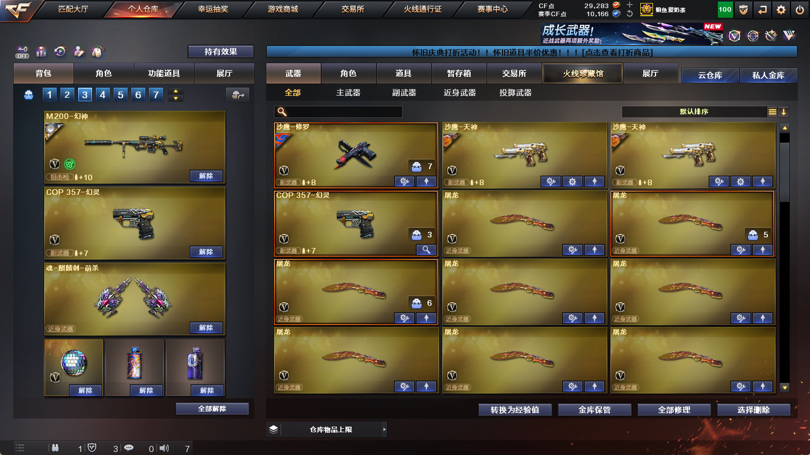 《m200幻神+幻神动感闪耀》《王者之怒》《cop幻灵 1911大黄蜂》《玄武》《王者火魄》《qbz金色蔷薇》《王者之心》《毁灭》《火麒麟》《雷神》《7烈龙》《乔伊教练 王者迷迭香 王者潘多拉 云海玲珑满配》《超级背包 亚洲杯纪念炫彩背包》《极光音效卡》a背包套装扩展券《永久ac 永久工具钳 永久手雷包》;QBZ03-金色蔷薇,M200-幻神,