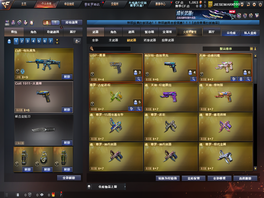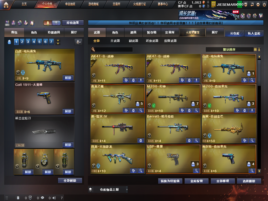 【主武器】M200-幻神/M200-幻神竞技荣光/白虎电玩蓝兔/青龙之魄觉醒版/金色蔷薇古蛇迷踪/②雷神/火麒麟/黑武士/超新星热带奇洋/机械迷城/死神雪域霜狐/蔷薇qbz/烈火动感闪耀/猩红传说/暗月传说大炮/炼狱百战金芒/烈龙云海游龙/朱雀蛇隐宗/神圣爆裂者+末日3/深渊巨龙咆哮3/EVO赤血龙魂 【副武器}】柯尔特-竞技荣光/usp-雷暴/天神动感闪耀/修罗古蛇迷踪 【近身武器】屠龙/斩神刀雷暴/擎天竞技荣光/屠龙动感闪耀/擎天云海游龙/龙啸热带奇洋/麒麟刺百战金芒/金刚伞电玩红兔/迷你牛牛冰龙博士白虎裂空之翼 【投掷武器】⑧高爆竞技荣光+⑧烟上山/④高爆雷暴+④烟闪/迷你生化手雷 【角色】电竞教官云悠悠+四防/葵阿尔法武装/奇洋探员/乔伊教练/雪域霜狐/云海游龙/蛇隐宗/兰海滩派对/炫彩背包/圣龙戒/魔龙戒/ 【皮肤】幻神-黄忠皮肤/龙-破浪逐光+春桃+惊鸿皮肤/ 【音效卡】炼狱百战金芒音效卡/死神雪域霜狐音效卡 【道具】紫金大元首/全背包/AC/烟雾头/VIP6/手枪/步枪/狙击枪/生化弹夹/爆破全装号;USP-雷暴,电竞教官-云悠悠,QBZ03-金色蔷薇,M200-幻神,