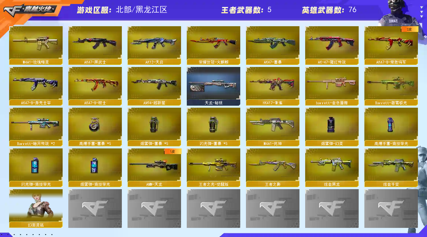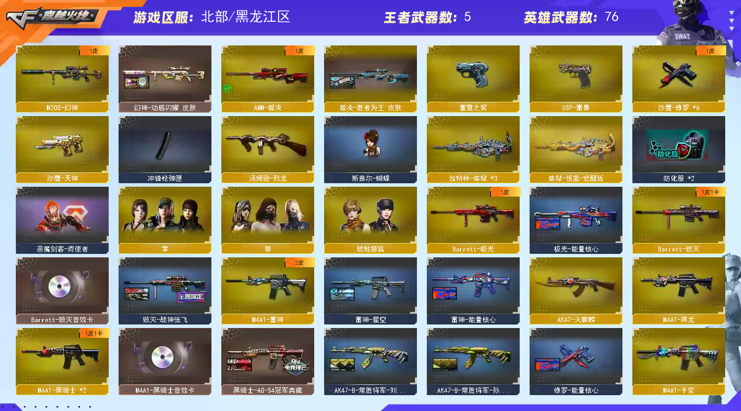 【M200-幻神】【AWM-裁决】【王者之光-觉醒版】【雷霆之契/沙鹰-天神/沙鹰-修罗(6)/USP-雷暴】【麒麟刺/龙啸(3)/擎天(3)/擎天-竞技荣光/王者之击-觉醒版/屠龙(5)/幻灵之锋/王者之锋-觉醒版/斩神刀-雷暴】【雷暴套装】【王者之影】【斯泰尔-蝴蝶】【零/零·纪元/葵/战地猎狐/灵狐者-职业经理/潘多拉-N/兰-海滩派对/樱-青春偶像 】【毁灭-战神张飞/极光-能量核心/天龙-CFSTAR/天龙-秘银/AK47-B-常胜将军-刘备/AK47-B-常胜将军-孙权/AK-47-雷神/雷神-能量核心/雷神-星空/战神-流金岁月皮肤/修罗-CFSTAR/修罗-能量核心】【M4A1-黑骑士音效卡/Barrett-毁灭音效卡】【Barrett-毁灭/Barrett-极光/barrett-金色蔷薇/Barrett-暗月传说(2)/AWM-天龙/M4A1-雷神/M4A1-死神/M4A1-黑龙/M4A1-千变/M4A1-黑骑士(2)/M4A1-玫瑰精灵/HK417-朱雀/AK12-天启/AK47-火麒麟/荣耀世冠-火麒麟/AK47-雷暴/AK47-黑武士/AK-47-猩红传说/AK47-B-身先士卒/AK47-B-常胜将军/AK47-B-战士/AN94-超新星/Barrett-碧霄极光】;USP-雷暴,M200-幻神,