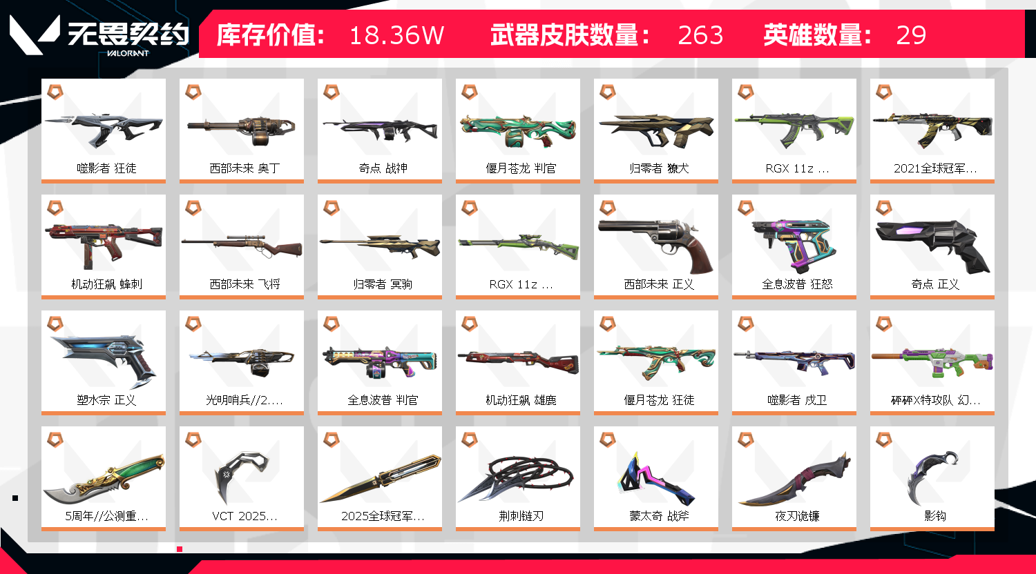 狂徒:21冠军❤️25冠军❤️盖亚❤️紫金❤️掠夺❤️弃王❤️猴子❤️朋克❤️苍龙❤️显卡❤️归零❤️摩托❤️噬影者❤️颗秒❤️猫猫ak 近战:怜悯之刃❤️22冠军蝴蝶刀❤️25冠军蝴蝶刀❤️电光蝴蝶刀❤️2025VCT爪刀❤️2026VCT篆刀❤️超时空卫队三棱军刺❤️荆刺链刃❤️掠夺爪刀❤️苍龙小刀❤️猫猫棒❤️嘟昂嘟昂拳套❤️船长铁钩❤️盖亚之愠❤️鬼丸太刀❤️摩托直刀❤️神罚小刀❤️神罚锤子❤️天玄刀❤️天御刀❤️夜刃诡镰❤️影刃❤️西部斧子❤️鱼扇❤️生物收割器❤️颗秒军刀 幻影:电玩❤️22冠军❤️光谱❤️西部❤️玩具❤️恶鬼❤️侦查❤️源能者危机❤️朋克❤️颗秒m4 冥驹:弃王❤️苍龙❤️电玩❤️归零❤️起源❤️朋克❤️上古龙炎❤️颗秒大狙 正义:摩托❤️奇点❤️塑水宗❤️西部❤️颗秒 鬼魅:天界❤️掠夺❤️超时空卫队 标配:24vctkru❤️24vctprx❤️光谱❤️紫金 戍卫:破败❤️噬影者❤️掠夺❤️天界❤️紫金❤️朋克 獠犬:归零❤️781 奥丁:西部❤️哨兵 战神:奇点 莽侠:显卡 飞将:天界❤️西部 短炮:归零 雄鹿:摩托❤️起源 判官:苍龙❤️波普 狂怒:波普 蜂刺:摩托 骇灵:哨兵 追猎:掠夺;西部未来 奥丁,奇点 战神,5周年//公测重制版 苍龙之刃,VCT 2025 爪刀,起源 雄鹿,偃月苍龙 判官,归零者 獠犬,