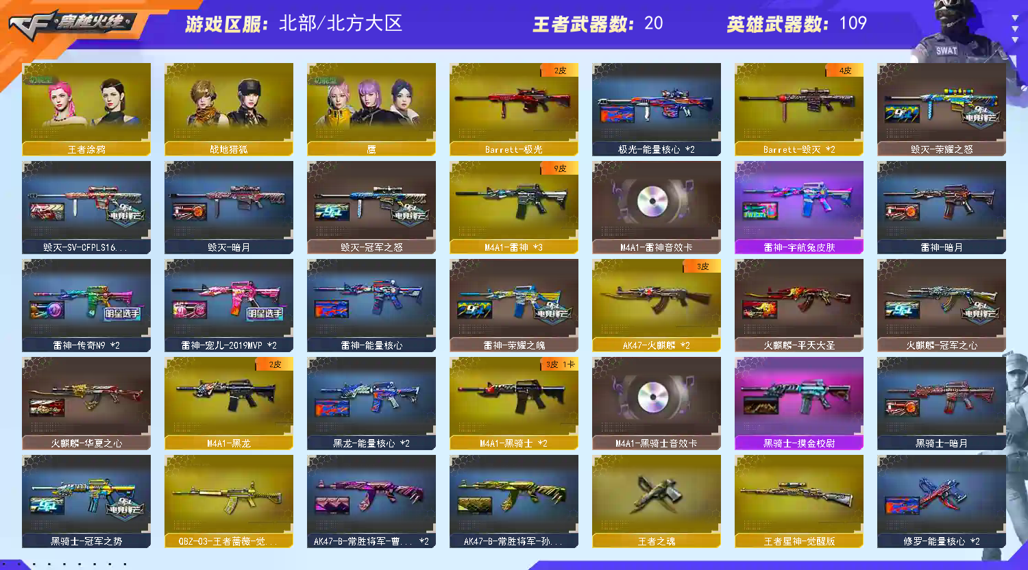 【M200-幻神+幻神-宠儿+幻神-n9+电流骇客+星火小队】【竞技荣光套+云悠悠+USP雷暴】【王者星神】【传说圣灵】【ScarLight-白虎+音效卡+冠军之虎】【QBZ03-金色蔷薇+破浪逐光】【裁决】【毁灭+毁灭-荣耀之怒+毁灭-冠军之怒】【极光】【火麒麟+火麒麟-冠军之心】【黑龙+音效卡】【雷神+雷神-传奇n9+雷神-宠儿+雷神-荣耀之魄】【黑骑士+音效卡+黑骑士-冠军之势】【王者之心 王者之魄】【千变 无影 天启 机械迷城 玫瑰精灵】【13手枪 修罗*5 天神*2 usp雷暴 冠军之特】【21近战 屠龙*6 龙啸 擎天 麒麟刺*2 炽芒蝶刃蝴蝶刀+破浪逐光 王者之啸*2 王者之击】【手雷 雷霆雷 堕天神*2 竞技荣光*3 云龙雷】【四防 王者葵貂蝉 王者涂鸦】;USP-雷暴,柯尔特-冠军之特,炽芒蝶刃,电竞教官-云悠悠,RPK-盘龙,QBZ03-金色蔷薇,M200-幻神,