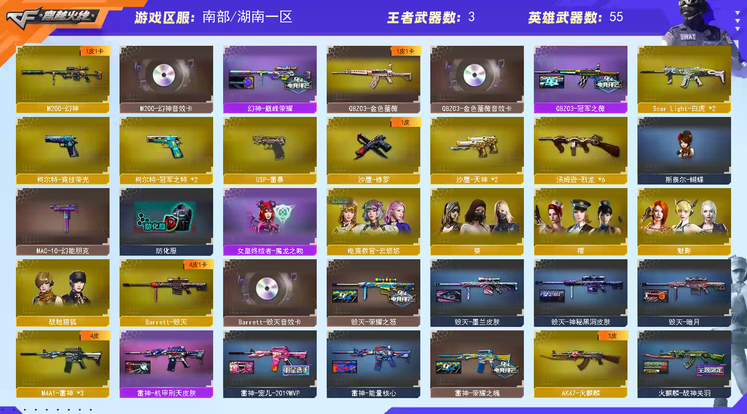 ★收藏好评! 由于异地登录保护机制,部分客户在使用客户端自动上号时会出现密码错误,注意本号密码不会错误,请多尝试5-6次!本账号已经过虚拟财产,请各位科技大神高抬贵手。请素质租号,文明游戏,谢谢大家配合!!!;USP-雷暴,柯尔特-冠军之特,电竞教官-云悠悠,QBZ03-金色蔷薇,M200-幻神,Scar Light-白虎,