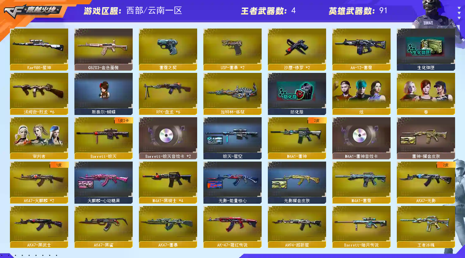 西部❤【98k星神+usp雷暴*2】【6盘龙 6烈龙 蝴蝶 】【qbz金色蔷薇】【火麒麟】【雷神+