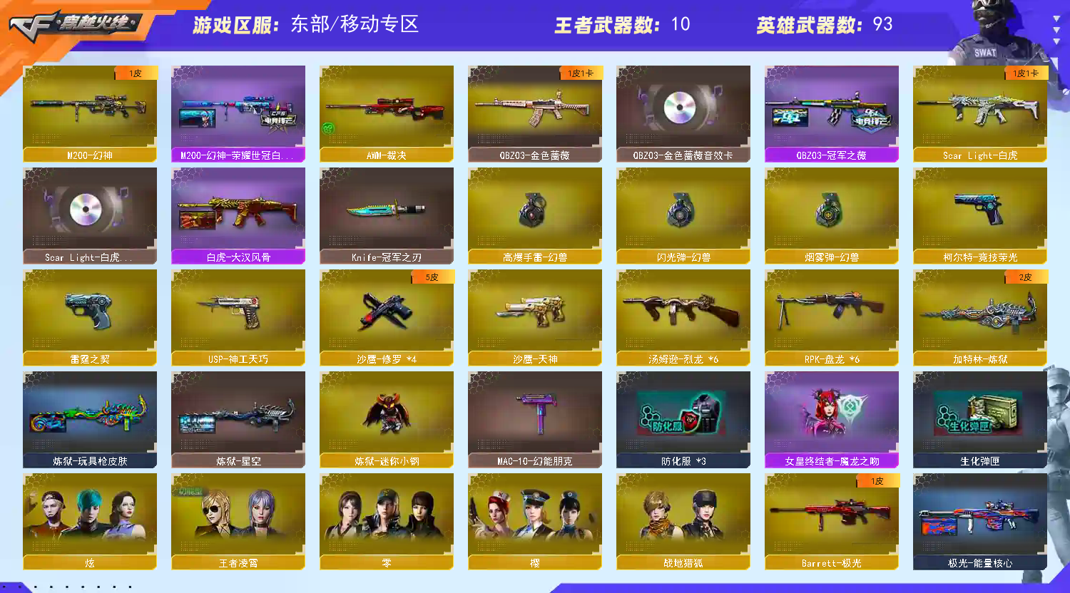 首页 > 租号大厅 > 穿越火线 > 其他大区/移动专区 > 旺仔C59☆92V幻神白鲨雷霆神功天巧套装+荣耀/2020/CFPL冠军皮肤+6烈6盘炼狱生化套装。