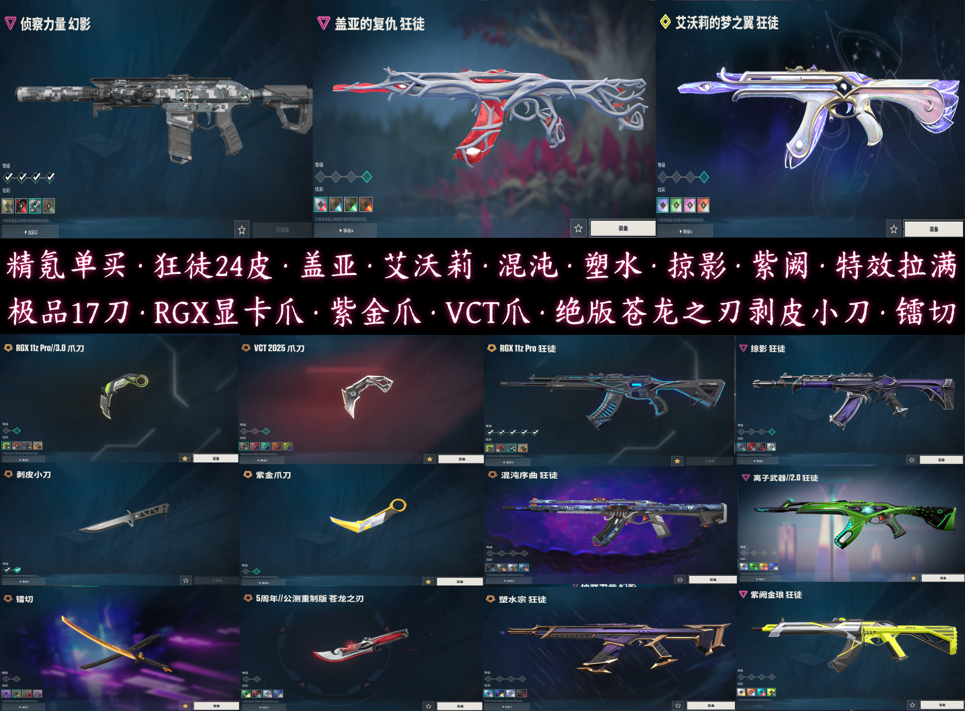 精氪毕业皮齐全特效炫彩拉满狂徒24皮⚡RGX显卡紫金爪VCT剥皮刀苍龙刃⚡盖亚艾沃莉混沌塑水紫阙侦查