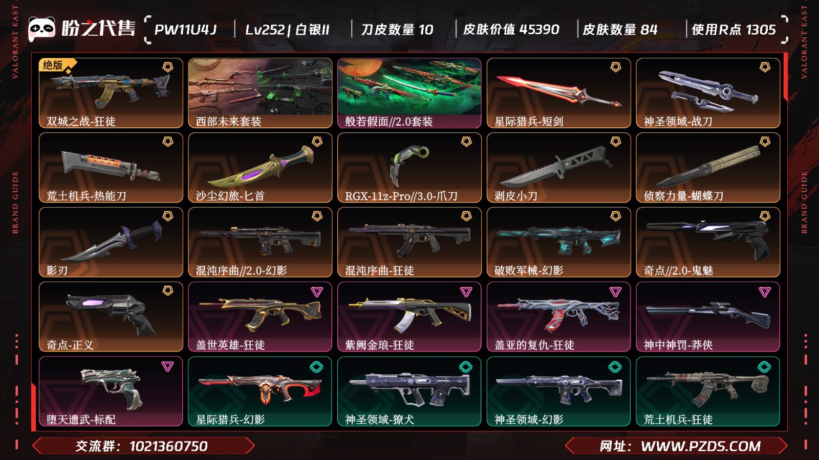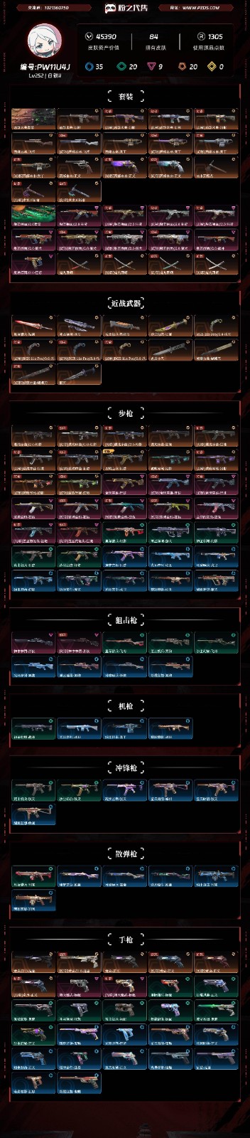【皮肤资产价值】45390 【使用R点】1305 【英雄数量】27 【皮肤数量】84 【卡面数量】133 【喷漆数量】104 【挂件数量】91 【拥有套装】西部未来套装(西部未来-幻影,西部未来-奥丁,西部未来-飞将,西部未来-正义,未来开拓者)般若假面2.0套装(般若假面//2.0-狂徒,般若假面//2.0-獠犬,般若假面//2.0-战神,般若假面//2.0-狂怒,鬼丸国纲) 【拥有近战武器】星际猎兵-短剑,神圣领域-战刀,荒土机兵-热能刀,沙尘幻旅-匕首,RGX-11z-Pro//3.0-爪刀,剥皮小刀,侦察力量-蝴蝶刀,影刃, 【拥有步枪】混沌序曲//2.0-幻影,混沌序曲-狂徒,双城之战-狂徒,破败军械-幻影,盖世英雄-狂徒,紫阙金琅-狂徒,盖亚的复仇-狂徒,星际猎兵-幻影,神圣领域-獠犬,神圣领域-幻影,荒土机兵-狂徒,沙尘幻旅-狂徒,瑰梦艺语-狂徒,光环序列-戍卫,月球哨兵-戍卫,,逆冲蛮牛-獠犬,逆冲蛮牛-戍卫,萌彩剪影-戍卫,胡桃狂想-獠犬, 【拥有狙击枪】神中神罚-莽侠,星际猎兵-飞将,荒土机兵-冥驹,沙尘幻旅-飞将,光环序列-冥驹,星云暗涌-冥驹,月球哨兵-莽侠,胡桃狂想-冥驹, 【拥有机枪】神圣领域-战神,光环序列-战神,,萌彩剪影-战神, 【拥有冲锋枪】荒土机兵-骇灵,沙尘幻旅-骇灵,瑰梦艺语-骇灵,星云暗涌-蜂刺,星云暗涌-骇灵,胡桃狂想-蜂刺, 【拥有霰弹枪】星际猎兵-判官,瑰梦艺语-雄鹿,月球哨兵-雄鹿,逆冲蛮牛-雄鹿,,萌彩剪影-判官, 【拥有手枪】奇点//2.0-鬼魅,奇点-正义,堕天遗武-标配,星际猎兵-标配,日耀风暴-正义,诡秘蛇影-鬼魅,神圣领域-狂怒,荒土机兵-标配,超能偶像-标配,流星兵团-鬼魅,沙尘幻旅-正义,瑰梦艺语-鬼魅,光环序列-狂怒,星云暗涌-鬼魅,月球哨兵-正义,,逆冲蛮牛-狂怒,复古浪潮-正义,光导纤维-鬼魅,宿怨-鬼魅,萌彩剪影-狂怒,胡桃狂想-鬼魅, 【稀有挂件】V25第三幕超凡挂饰,第九季神话挂饰,终章猫猫木乃伊挂饰,猫猫木乃伊挂饰,熔岩灯挂饰,袖珍捷风挂饰,糖葫芦挂饰,迷你浓缩挂饰,第八季超凡挂饰,终章迷你机甲挂饰,战术河童挂饰,传世莲华挂饰,好运福爪挂饰,瞄这里挂饰,第七季钻石挂饰,幸运中国结挂饰, 【卡面信息】分神的决斗者卡面,西部未来卡面,先驱者卡面,分崩离析卡面,双城之战拥抱卡面,情人节捷风卡面,Luie卡面,;