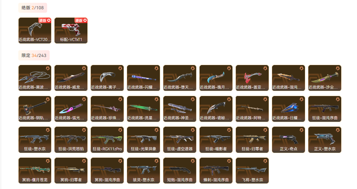 wegame无畏契约★ 刀皮数量18,枪皮数量163(绝版2限定36终极0卓越23);皮肤资产价值81940,近战武器-VCT2025爪刀,近战武器-闪耀之星荧光棒,近战武器-离子武器2.0爪刀,近战武器-威龙之刃,近战武器-混沌大剑,近战武器-堕天遗武仪式匕首,近战武器-沙尘幻旅匕首,标配-VCTxT1,正义-奇点,正义-塑水宗,短炮-混沌序曲,骇灵-塑水宗,蜂刺-混沌序曲,狂徒-塑水宗,狂徒-归零者