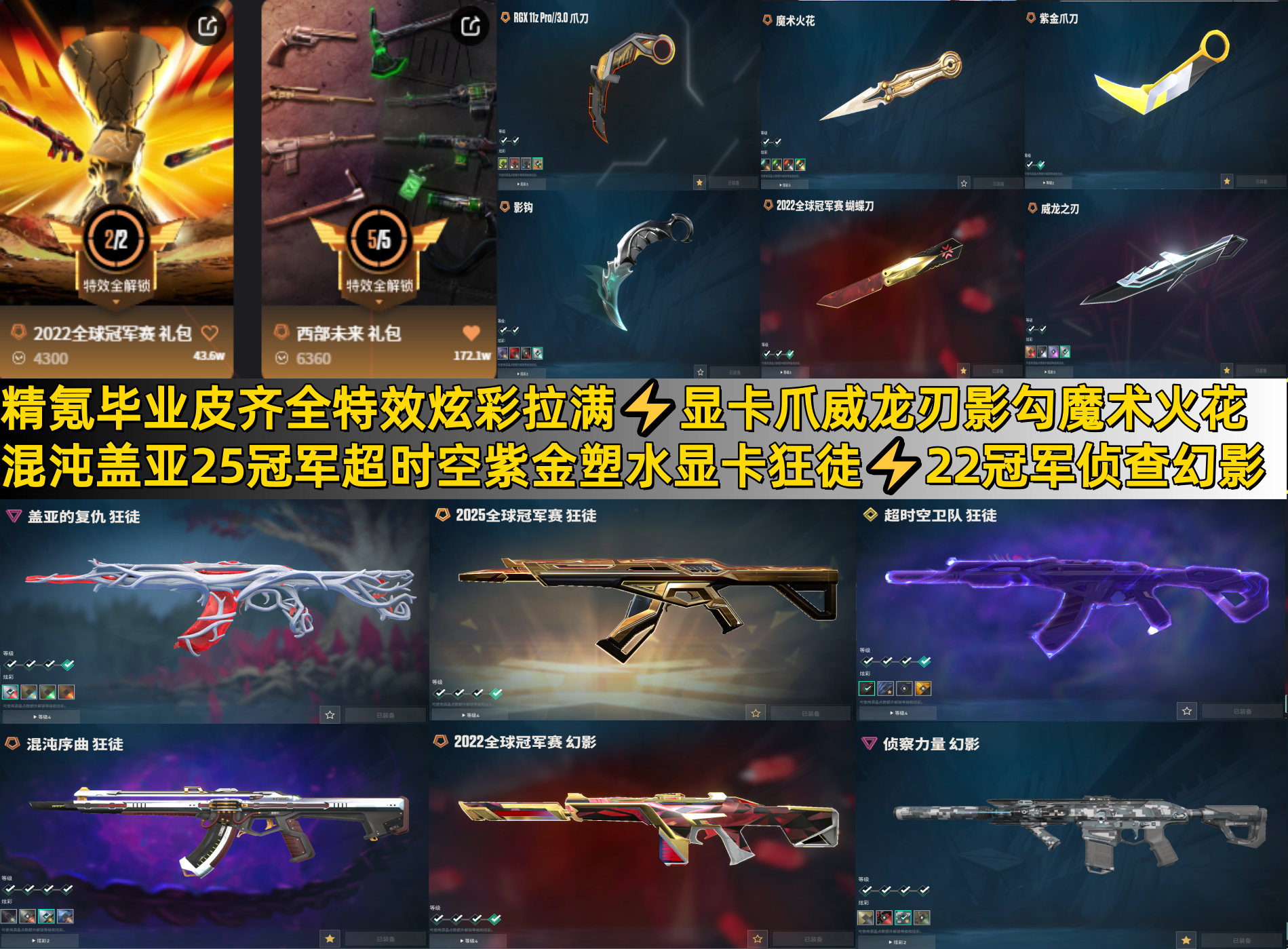精氪毕业皮齐全特效炫彩拉满⚡显卡紫金威龙刃影勾魔术火花22蝴蝶刀⚡25冠军混沌盖亚超时空狂徒侦查幻影