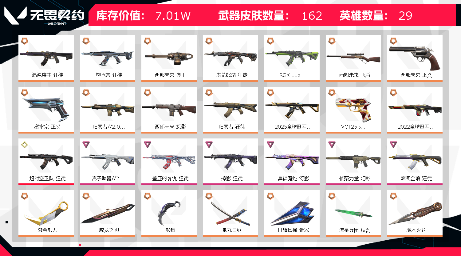 首页 > 租号大厅 > 无畏契约-wegame > wegame/wegame > 精氪毕业皮齐全特效炫彩拉满⚡显卡紫金威龙刃影勾魔术火花22蝴蝶刀⚡25冠军混沌盖亚超时空狂徒侦查幻影