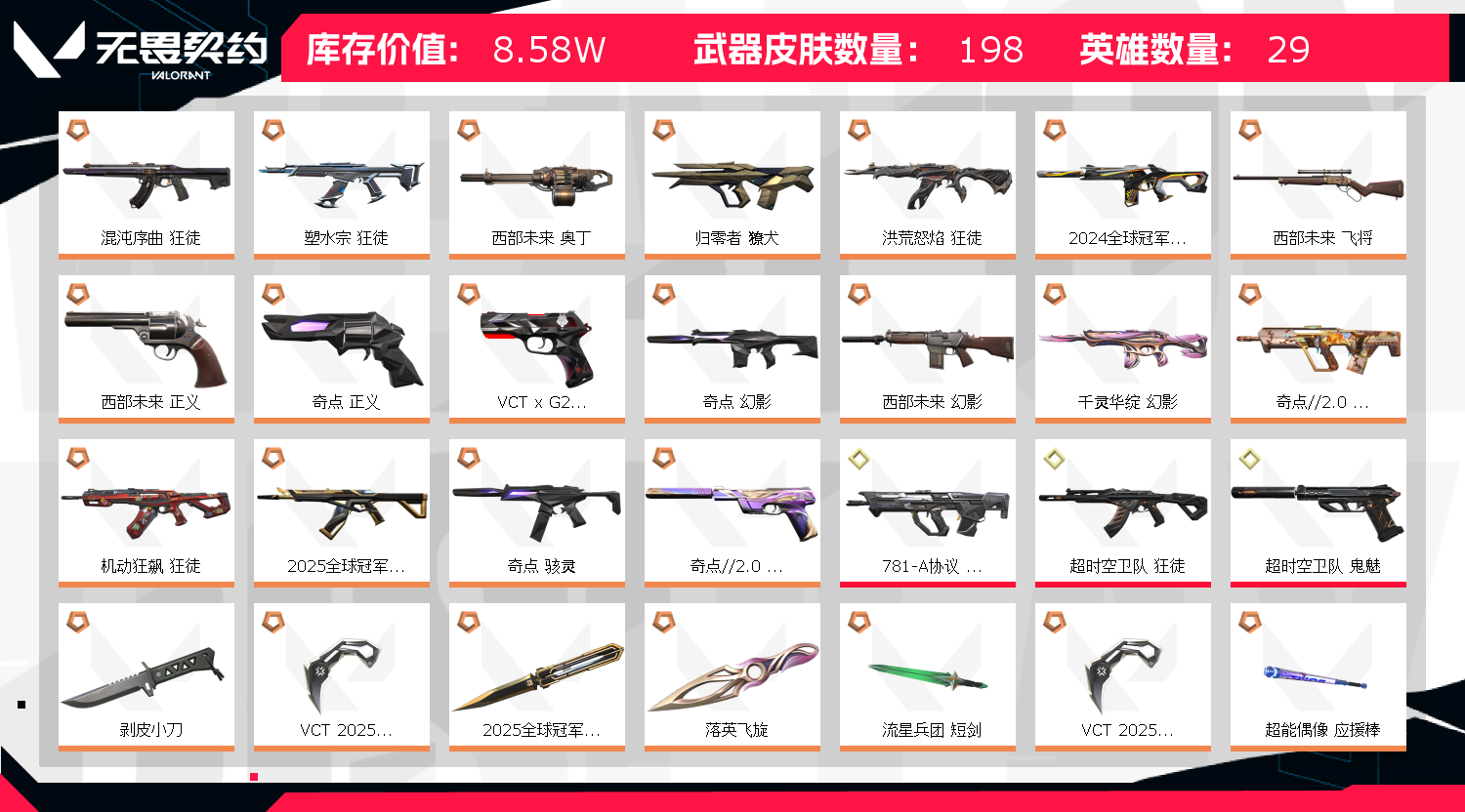 郑重声明:若出现 账号封禁/毁号等情况,本人商户多年,所属账号已在派出所备案,经过网络财产备案价值! 使用外挂脚本导致游戏账号封禁直接向平台提取ip地址!一经发现直接报警处理立案追责,根据账号价值追究其法律责任! 请租客文明游戏,不要开挂或挂机!切勿心存侥幸!因无畏契约检测严格,为防止后台插件导致封号,上号前请务必重启电脑! 注意事项:出现冻结,我们看到后会及时解冻。等5-10分钟重新登陆即可 1.登陆界面稍等2分钟会上去(自动登录)老板不要着急,一次不行多来几次wegame界面要耐心等2分钟 2.密令会自动输入如果一次不成功多来几次。 3..进入wegame后到弹短信验证处,关闭掉,重新下载无畏契约这个游戏即可成功上号,记住。这个方法百分百上号成功!就是进入wegame重新下载无畏契约游戏 !!!百分百成功!! 4.请及时续租不要挂机,到时不下线,但是下一个会挤号导致挂机,所以请及时续租,导致禁赛的一律拉黑 。 5.祝老板玩的愉快,喜欢可以收藏关注;西部未来 奥丁,剥皮小刀,VCT 2025 爪刀,天界神兵//2.0 幻影,归零者 獠犬,盖亚的复仇 狂徒,洪荒怒焰 狂徒,
