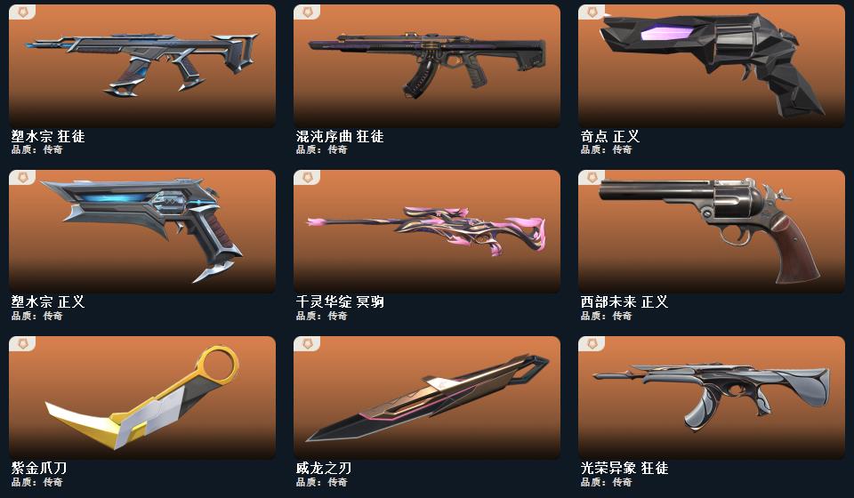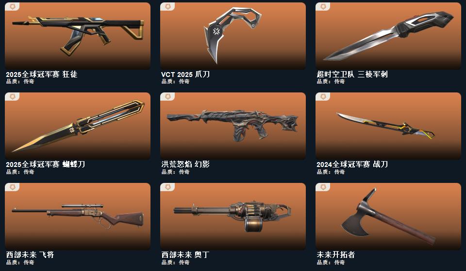 wegame无畏契约★刀皮数量13,枪皮数量153(绝版5限定27终极5卓越10);近战武器-2025全球冠军赛蝴蝶刀,近战武器-2024全球冠军赛战刀,近战武器-VCT2025爪刀,近战武器-紫金爪刀,近战武器-威龙之刃,近战武器-沙尘幻旅匕首,近战武器-钢轨卫士战锤,标配-VCTxBLG,狂徒-2025全球冠军赛,正义-奇点,正义-塑水宗,正义-西部未来,短炮-洪荒怒焰,狂徒-塑水宗,狂徒-混沌序曲,狂徒-光荣异象,幻影-洪荒怒焰