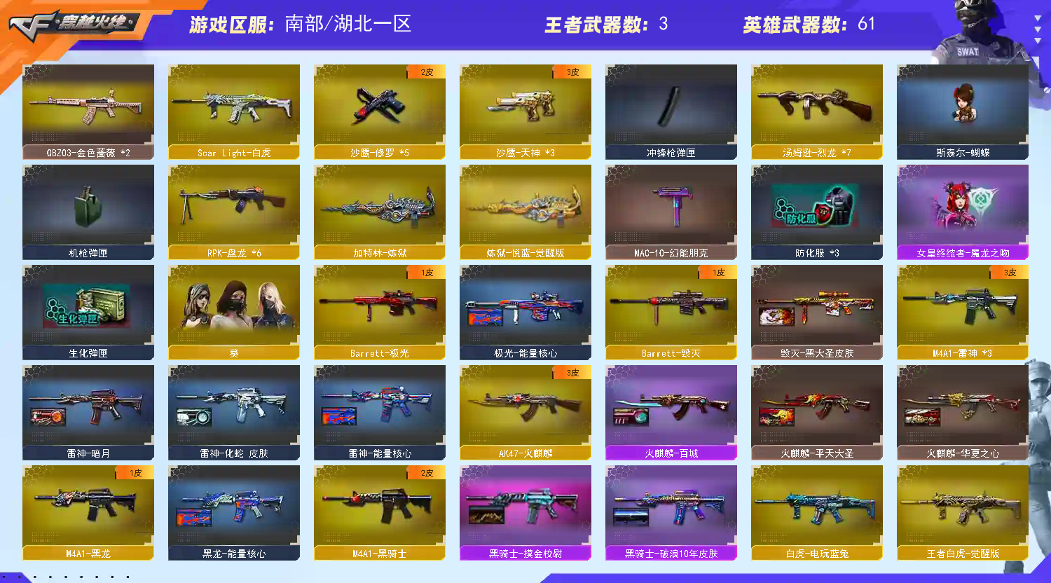 61v-王者白虎-qbz-火麒麟-黑龙-雷神-黑骑士-白虎蓝兔 91烈火-毁灭 -6盘龙-炼狱悦蓝-6烈龙-斯太尔蝴蝶-修罗-天神-屠龙-龙啸-擎天-麒麟刺 请看截图 喜欢请点收藏 方便下次租 可以当成自己号玩【感谢老板租此号】优质账号 如果有个别装备到期 影响不大的情况下请不要维权,如遇到账号密码错误 顶号 冻结 请直接维权即可, 科技大佬麻烦看了请绕道,出zu不易,给你跪下了!;RPK-盘龙,QBZ03-金色蔷薇,Scar Light-白虎,