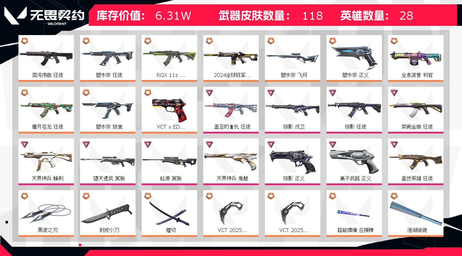 允许 英雄28 武器皮肤数量115 很多毕业皮 🈲挂机!!!可排位;黑波之刃,剥皮小刀,镭切,VCT 2025 爪刀,盖亚的复仇 狂徒,掠影 戍卫,掠影 狂徒,