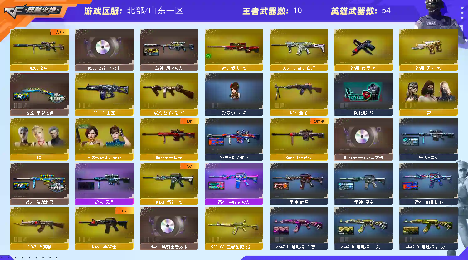 >>>>>>毁号,涉及毁坏虚拟财产罪及计算机安全罪,请文明游戏素质游戏,让我们共建美好租号平台>>>>>> 本游戏账号:英雄武器54个; 王者武器14个。 装备不多,但是主武器、副武器、近身武器够用 拥有完美游戏体验。重要是,特殊装备有:AK47-火麒麟、麒麟刺、M200-幻神、HK417-朱雀、王者之怒、王者之幻、王者之武、王者之啸、王者之击、炫金武士、火麒麟-灵狐、王者之魄高爆手雷、堕天使、王者-瞳-闭月羞花、堕天使道具卡、王者之啸金色光效、M4A1-黑骑士音效卡、等,随意畅选。 注意事项: A.游戏过程中请不要恶意挂机或者不文明发言 B.恶意挂机、顶号等行为将被拉黑无法再次下单 C.进入游戏后中途请勿退出登陆,否则无法再次上号 D.部分账号由于异地登录可能会出现密码错误提示,通常再尝试5-6次后可上号 |||||||||喜欢本账号请点 ☆收藏☆ 方便下次租用,谢谢光临惠顾|||||||||;RPK-盘龙,M200-幻神,Scar Light-白虎,