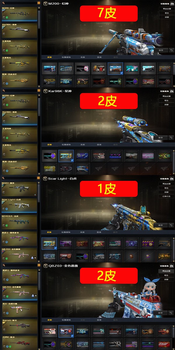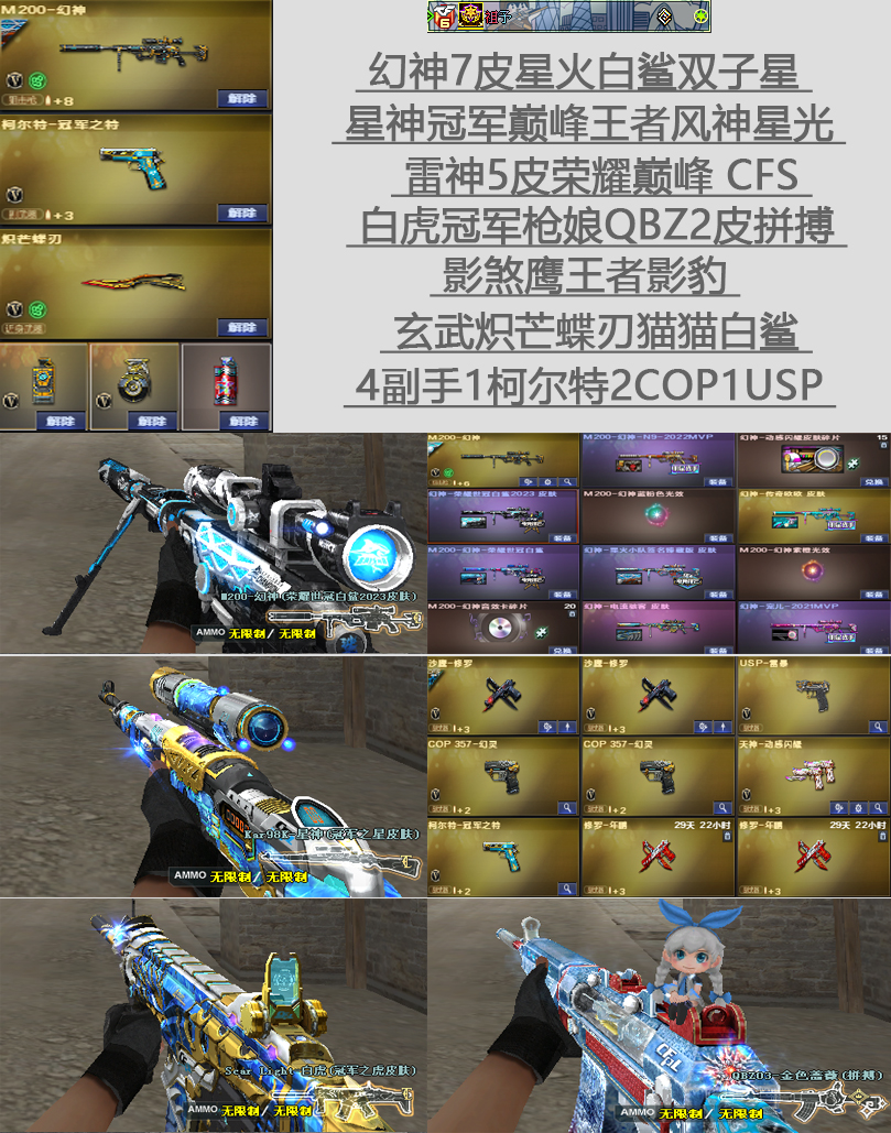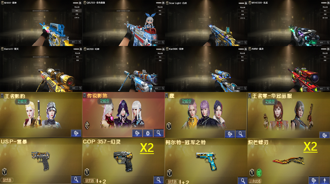 退排位拉黑;USP-雷暴,柯尔特-冠军之特,炽芒蝶刃,传说影煞,QBZ03-金色蔷薇,M200-幻神,Scar Light-白虎,
