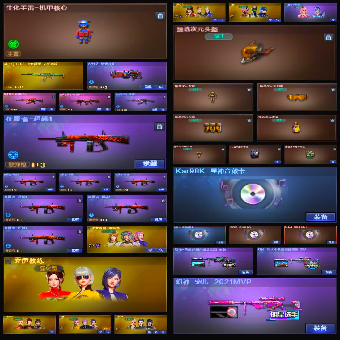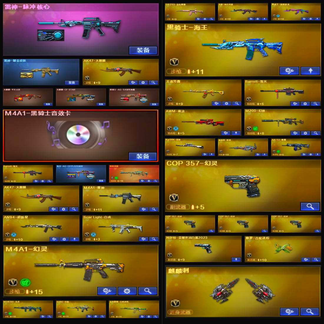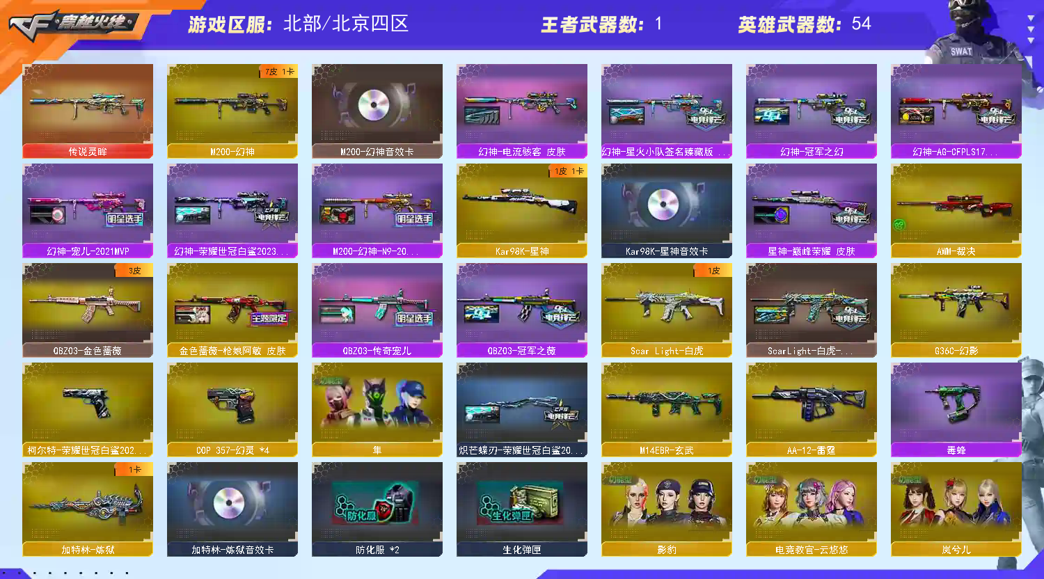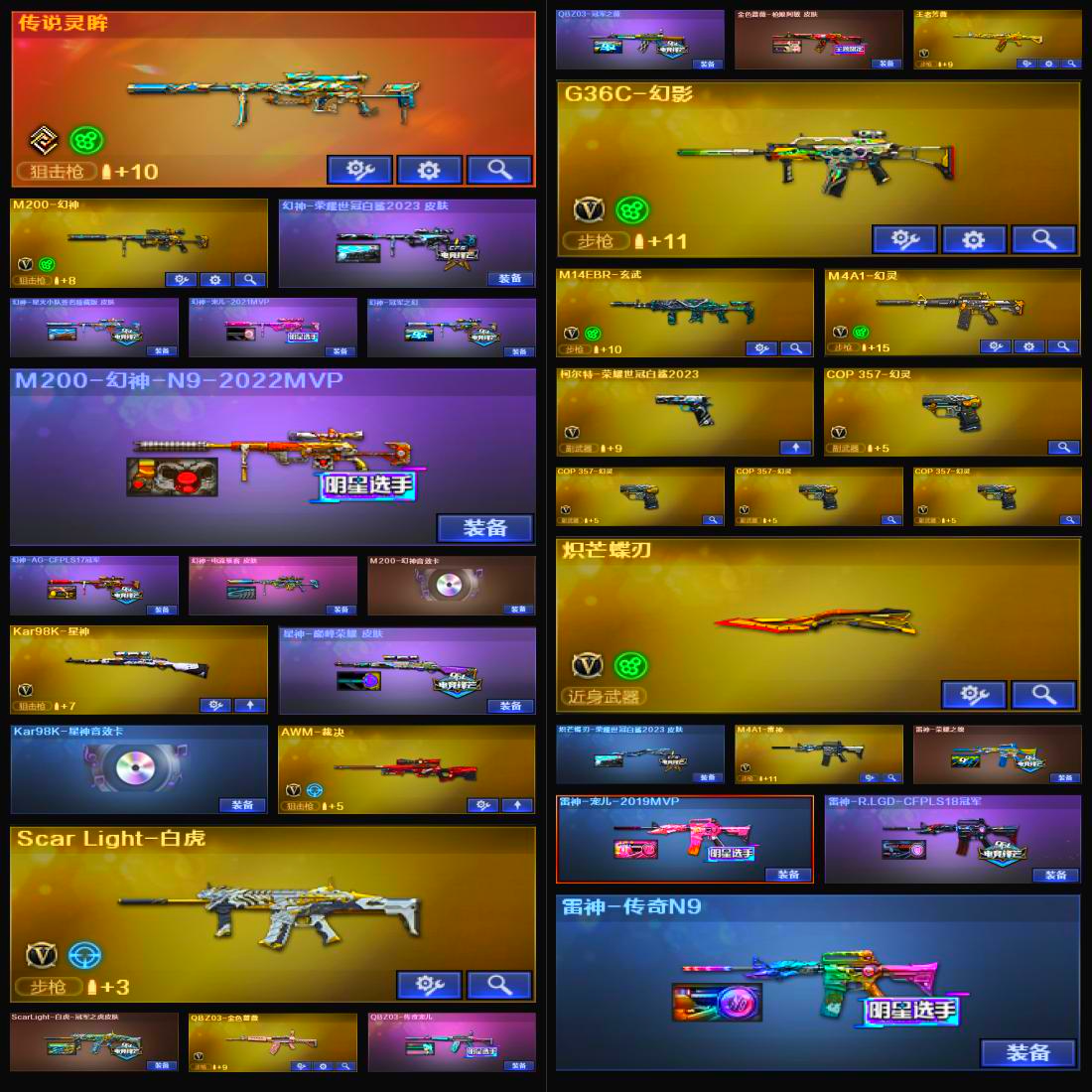 【幻神七皮三件套!!!】 【星神三件套!!!】【传说武器!!!】【M200幻神+宠儿皮肤+星火小队签名臻藏版皮肤+荣耀白鲨2023皮肤+CFPLS17冠军皮肤+N9皮肤+冠军之幻皮肤+电流骇客皮肤+柯尔特荣耀世冠白鲨2023+炽芒蝶刃+4防云悠悠】【98k星神+星神音效卡+巅峰荣耀皮肤】【传说灵眸】【白虎+冠军之虎皮肤】【qbz03金色蔷薇+冠军之薇皮肤+传奇宠儿皮肤+王者芳薇】【g36c幻影】【幻灵套装】【雷神+荣耀之魄皮肤+传奇n9皮肤+宠儿皮肤+CFPLS18冠军皮肤】【毁灭+CFPLS15冠军皮肤】【火麒麟 超新星 玄武 神兵利器 黑武士锦绣游龙 金色蔷薇古蛇迷踪 黑骑士海王 裁决 炼狱 AA12雷霆】——【cop357幻灵 柯尔特荣耀世冠白鲨2023 修罗古蛇迷踪】——【炽芒蝶刃 麒麟刺 幻灵之锋】——【幻灵投掷武器套装*10】——【朱雀蛇隐宗 雷神小红 AWM灵狐15周年嘉年华】——【角色】【4防(云悠悠 隼 岚兮儿 职业经理)】【鹰 影豹】;柯尔特-荣耀世冠白鲨2023,炽芒蝶刃,隼,电竞教官-云悠悠,QBZ03-金色蔷薇,G36C-幻影,M200-幻神,