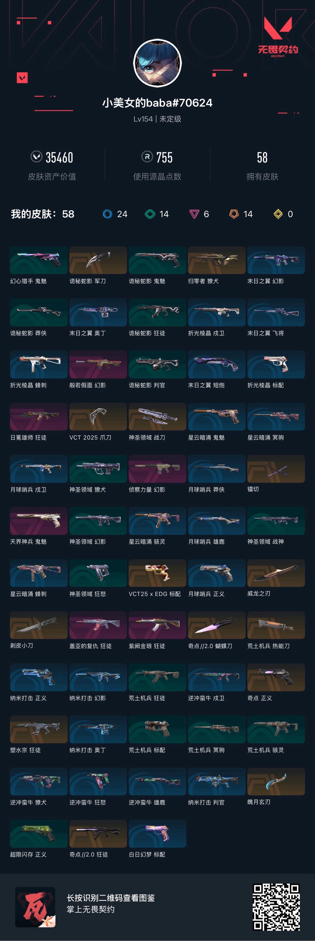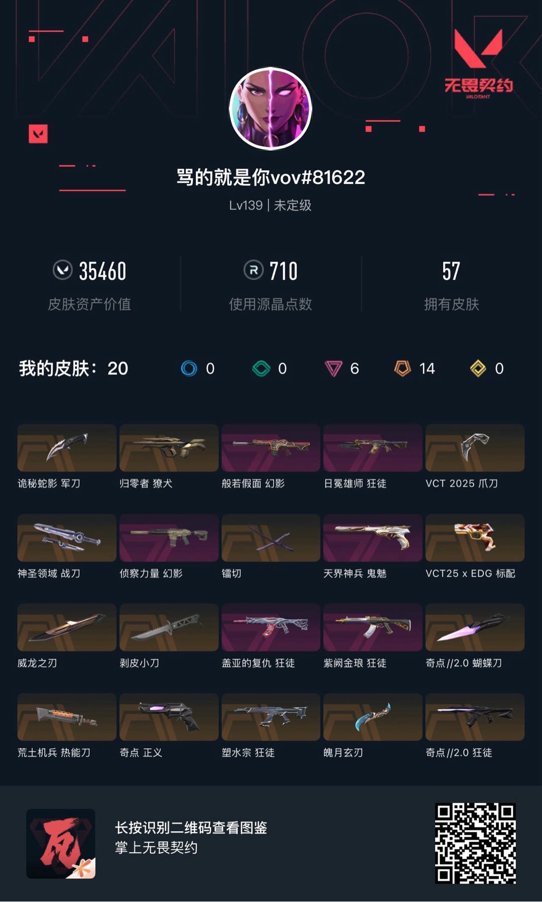 允许 英雄27 武器皮肤数量57;剥皮小刀,镭切,威龙之刃,VCT 2025 爪刀,归零者 獠犬,盖亚的复仇 狂徒,侦察力量 幻影,