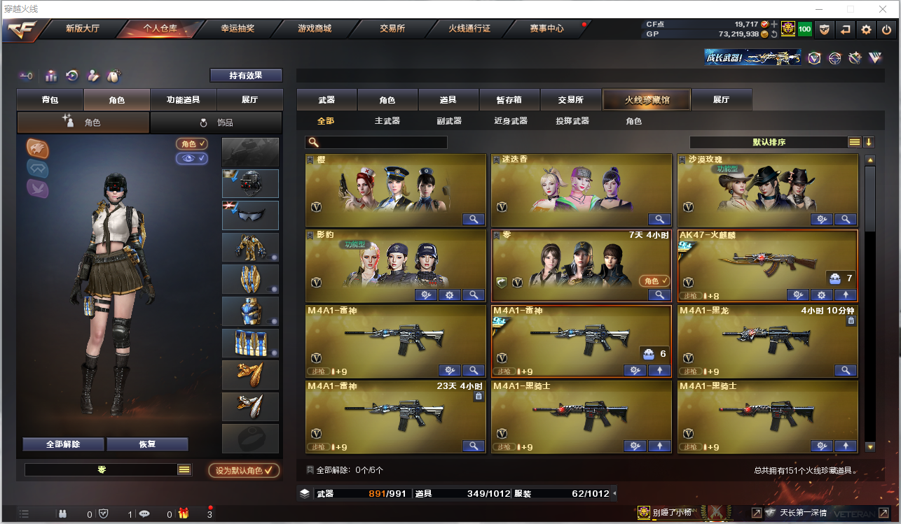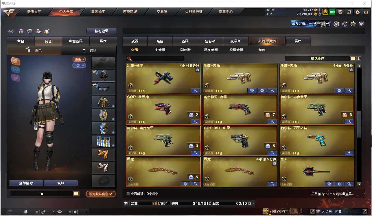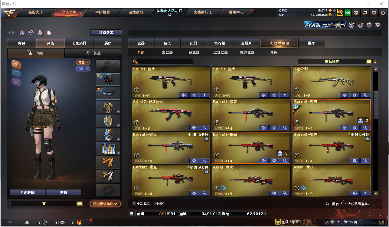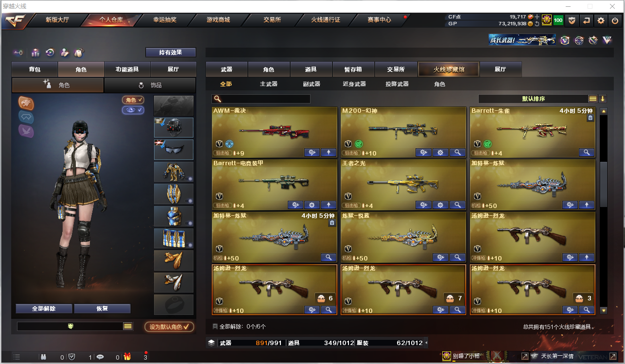 【角色】迷迭香,沙漠玫瑰,樱,影豹, 【主武器】m200-幻神,AK47-火麒麟,M4A1-雷神,M4A1-黑骑士,AK47-无影,AK47-黑武士,AK12-天启,AK47-黑鲨,M4A1-龙血,M4A1-夜魔。M4A1-幻灵,无影-神兵利器,QBZ03-金色蔷薇,9A-91-烈火,AK47-猩红传说,Barrett-毁灭,Barrett-极光,AWM-裁决,Barrett-电竞装甲,加特林-炼狱,汤姆逊-烈龙*7;死亡之眼,AA-12-雷霆。炫金雷神,炫金毁灭。炫金天龙,王者之翼,王者之影,王者之武,王者之光,王者之力, 【副武器】沙鹰-修罗,沙鹰-天神,COP-堕天神,破空枪刃-夜魔,柯尔特-电竞装甲,COP 357-幻灵,柯尔特-冠军之特,炫金修罗、 【近身武器】屠龙,擎天,尼泊尔-雷霆,麒麟刺-堕天神,龙啸-堕天神,马来剑-夜魔,尼泊尔-电竞装甲,幻灵之锋,王者之锋, 【投掷武器】雷霆套,堕天神套,夜魔套。电竞装甲套,幻灵套, 【音效卡】Barrett-毁灭音效卡,Barrett-极光音效卡,Barrett-毁灭音效卡, 【皮肤】QBZ03-冠军之薇,黑龙-冠军之武,黑骑士-冠军之势,战神-紫绶金章皮肤,无影-能量核心,无影耀金皮肤,毁灭耀金皮肤,AWM-天龙-传奇70kg,AWM-天龙-传奇白鲨,毁灭-冠军之怒,火麒麟-AG战队皮肤,雷神-冠军之魄,AK47老兵传说皮肤,火麒麟-冠军之心,修罗-冠军之魄,火麒麟-平天大圣,;柯尔特-冠军之特,Knife-冠军之刃,沙漠玫瑰,QBZ03-金色蔷薇,M200-幻神,