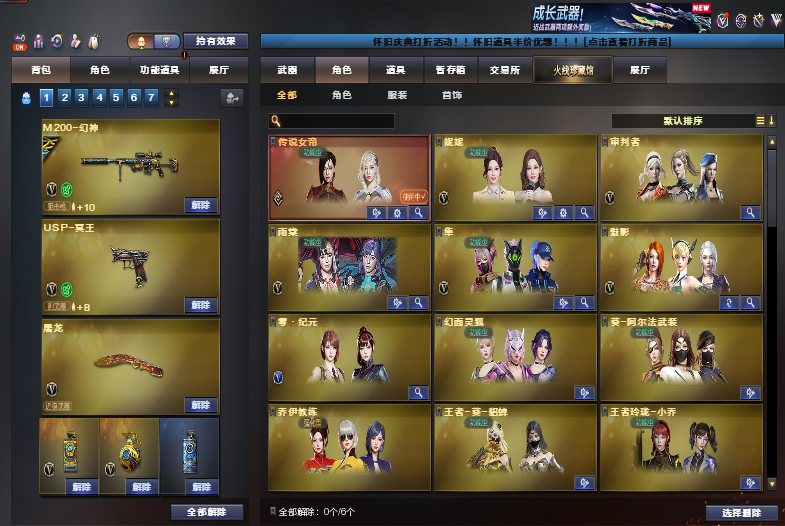 女帝妮妮多个四防,幻神双皮三件套,裁决巅峰荣耀三件套,G36C幻影,副武器拉满,生化6烈斯蝴蝶蛇影双骄,喜欢的点点收藏方便下次使用;USP-雷暴王者,柯尔特-荣耀世冠白鲨2023,柯尔特-冠军之特,炽芒蝶刃,传说女帝,隼,妮妮,