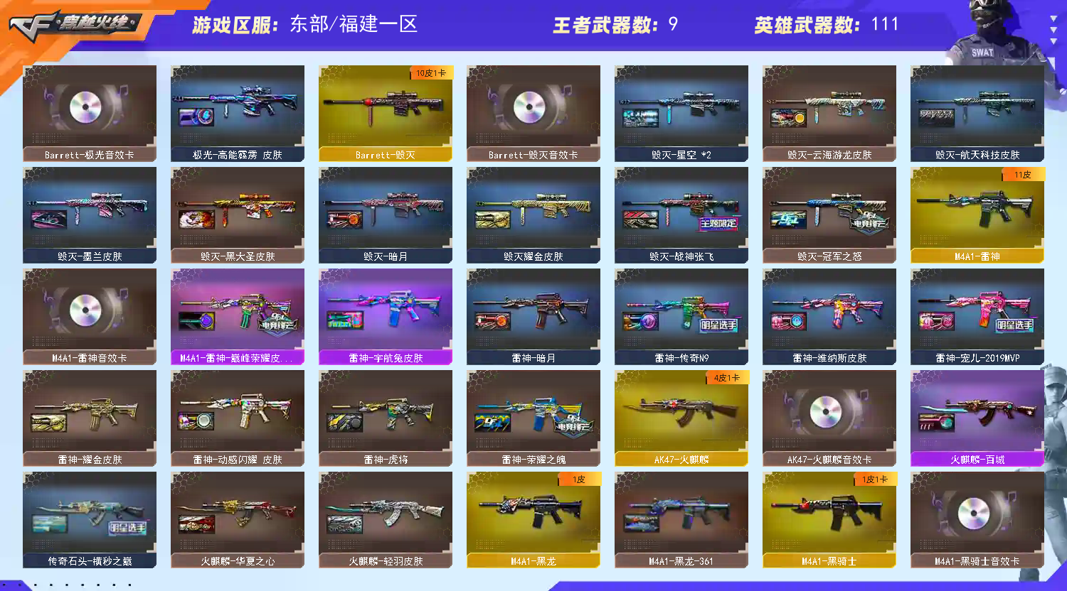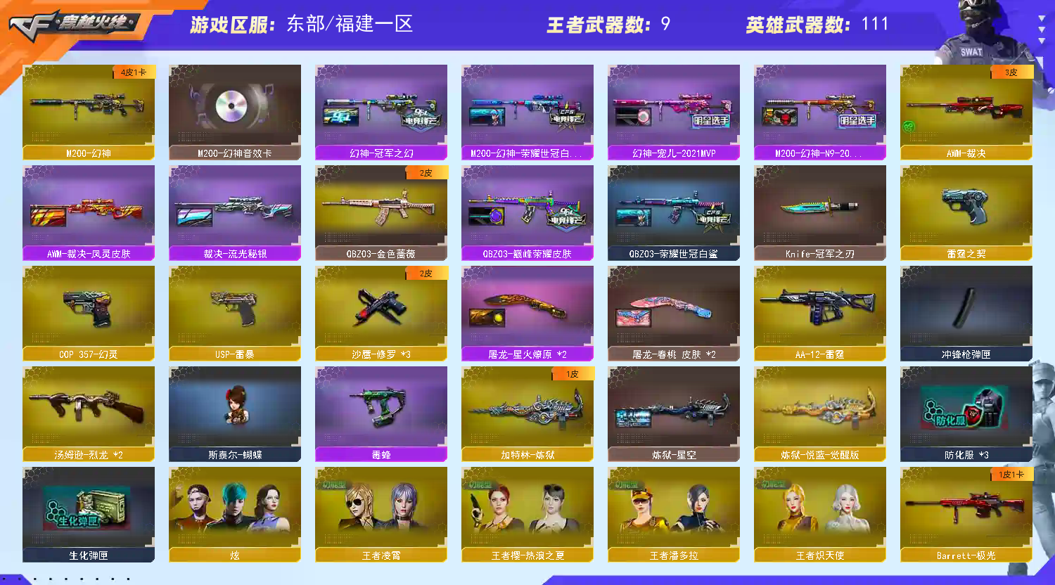 【幻神4皮带卡!!!】【m200幻神+幻神音效卡+宠儿皮肤+冠军之幻皮肤+n9皮肤+荣耀世冠白鲨皮肤+usp雷暴+冠军之刃】【毁灭+毁灭音效卡+冠军之怒皮肤】【火麒麟+火麒麟音效卡+横秒之巅皮肤】【黑骑士+黑骑士音效卡】【雷神+雷神音效卡+巅峰荣耀皮肤+宠儿皮肤+传奇n9皮肤+荣耀之魄皮肤】【极光+极光音效卡】【qbz03金色蔷薇+巅峰荣耀皮肤+荣耀世冠白鲨皮肤】【裁决+流光秘银皮肤】【幻灵套装】【王者白虎】【3烈龙+2炼狱】【火麒麟 黑龙 雷神 黑骑士 武圣 无影神兵利器 黑武士锦绣游龙 超新星热带奇洋 金色蔷薇古蛇迷踪 烈火 烈火动感闪耀 超新星悦享 天龙 毁灭 极光 裁决 】——【热门武器/小人呛】【朱雀蛇隐宗 斯泰尔蝴蝶 黄金猫猫手套白鲨】【usp雷暴 cop雷霆 cop幻灵 修罗 武圣 天神动感闪耀 修罗古蛇迷踪】【屠龙 龙啸 麒麟刺 尼泊尔雷霆 斩神刀雷暴 幻灵之锋 屠龙动感闪耀 擎天云海游龙 屠龙云海游龙 龙啸热带奇洋 龙啸云海游龙 王者之锋 龙啸烈火龙威】——【雷霆投掷套装*5】【雷暴投掷套装*4】【幻灵投掷套装*7】【云龙投掷套装】——【角色】【4防王者炽天使 王者凌霄 王者潘多拉】【炫】;USP-雷暴,Knife-冠军之刃,QBZ03-金色蔷薇,M200-幻神,