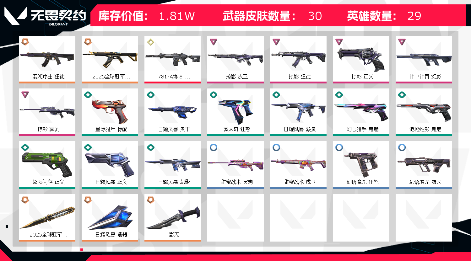 首页 > 租号大厅 > 无畏契约-wegame > wegame/wegame > 猛男带妹号25冠军套 混沌ak 781幻影 掠影套