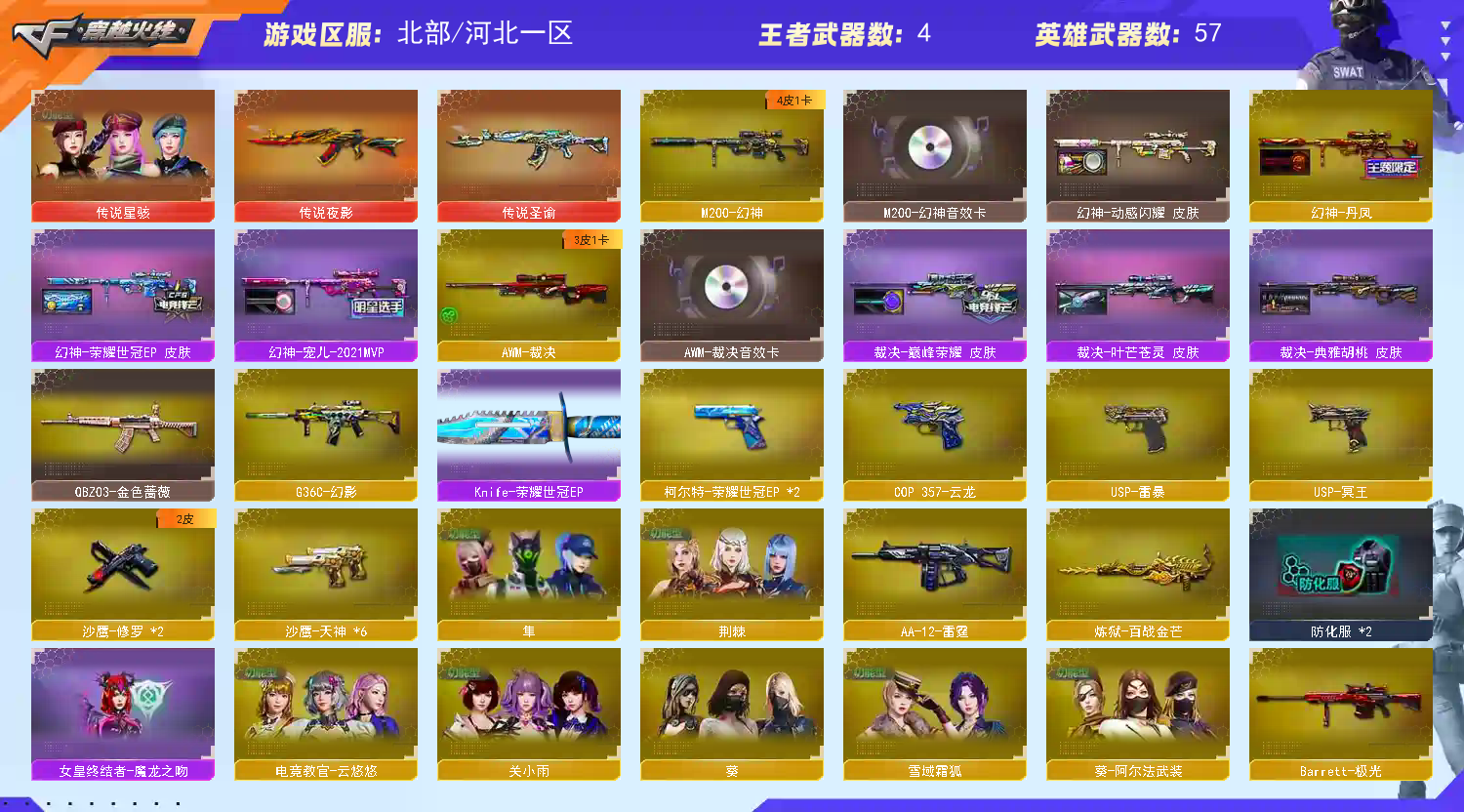 !!!!!!!!!!!!!!!!!! 租客必看: 【开鼠标宏, 开DMA, 开外挂的租客, 本店将起诉至法院索赔, 已起诉多名违规租客, 法网恢恢疏而不漏!!!】 【订单时间快到了禁止再开排位赛, 导致账号禁赛的租客将被永久拉黑!】 !!!!!!!!!!!!!!!!!! ①北部【北部极品号】: 【最期新活动拉满】 ✅爆破: ✦ 传说武器 |传说圣谕|传说夜影|传说星骇 ✦ 幻神4皮卡 | 幻神-荣耀世冠EP | 幻神-宠儿 | 幻神-丹凤 | 幻神音效卡 | ✦ 裁决3件套 | 裁决-巅峰荣耀 | 裁决-叶芒苍灵 | 裁决音效卡|裁决-胡桃 ✦ G36C-幻影 |白虎之魄| ✦ 满武武器: 1) USP*2 = USP-冥王 | USP-雷爆| 柯尔特*2 = 柯尔特-荣耀世冠ep*2|COP云龙 ✦ 王者冰锋|EP小刀 ②有什么问题请填写真实理由【不要无故撤单】否则拉黑, 本店将拉黑【恶意撤单/排位离线】的不文明租客 ③恶意开挂导致账号封禁者 本店将起诉至法院索赔 注重声明:本人资深程序员;精确定位你的所在,但凡涉及违规违约,必追究到底、绝不轻饶!;USP-雷暴,传说星骇,隼,电竞教官-云悠悠,QBZ03-金色蔷薇,G36C-幻影,M200-幻神,