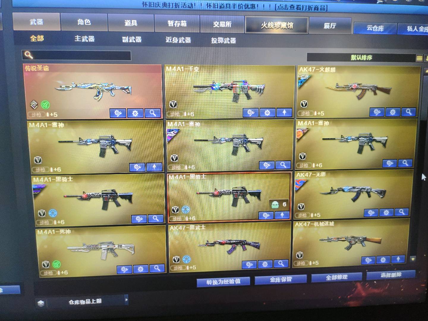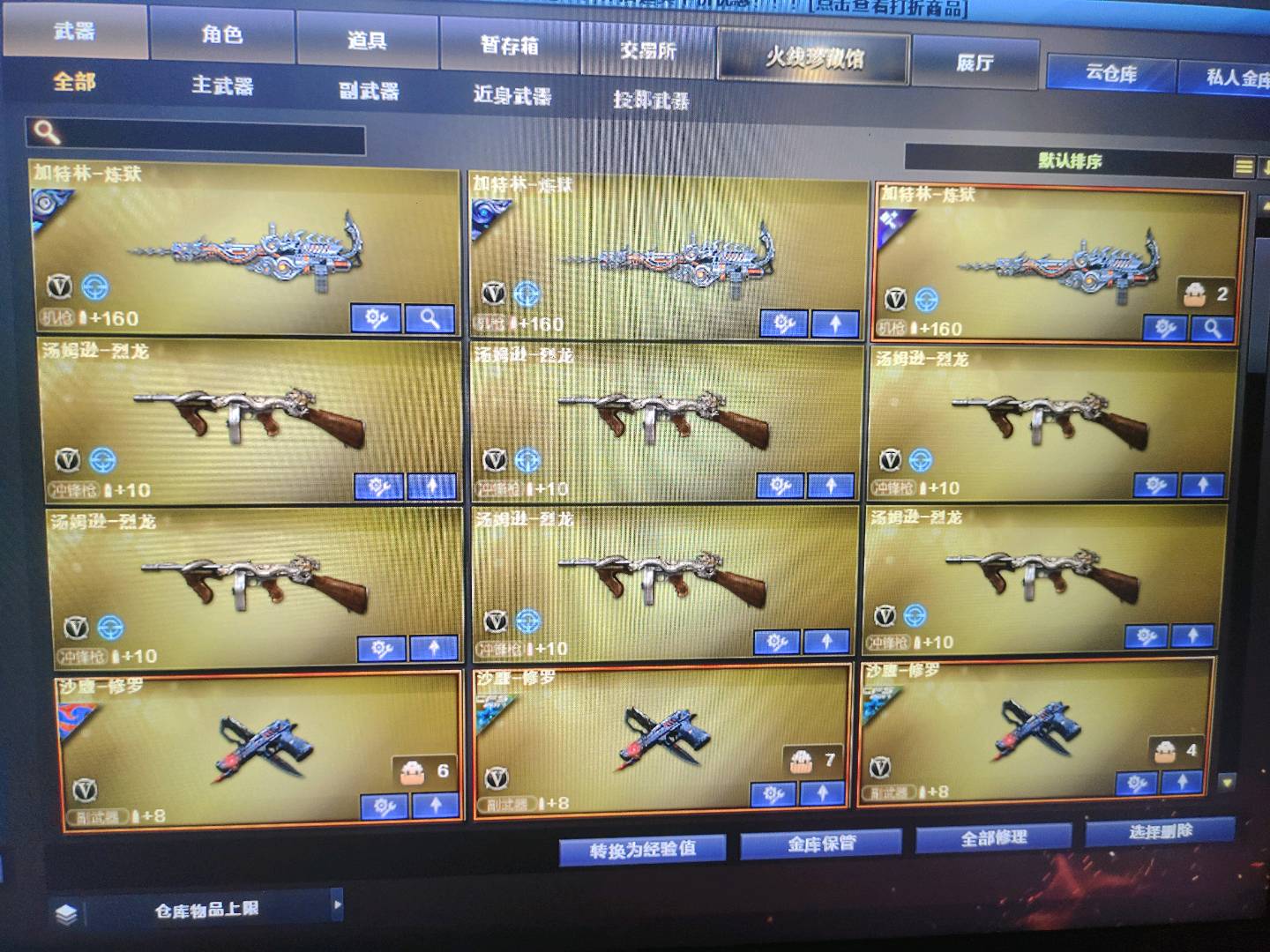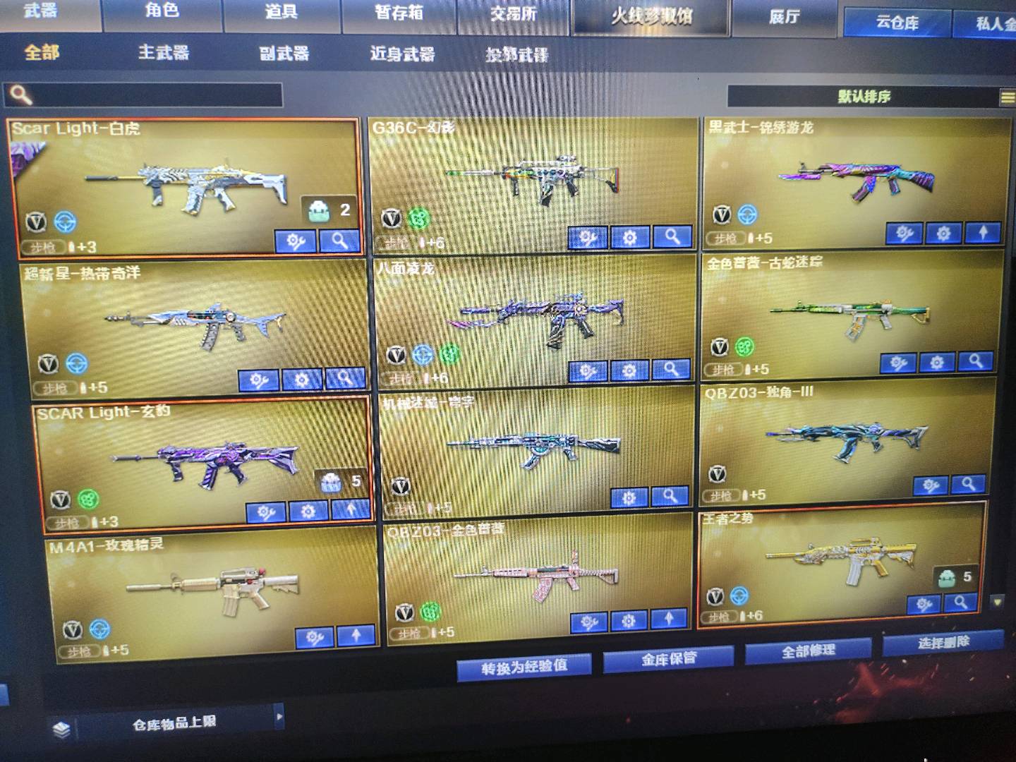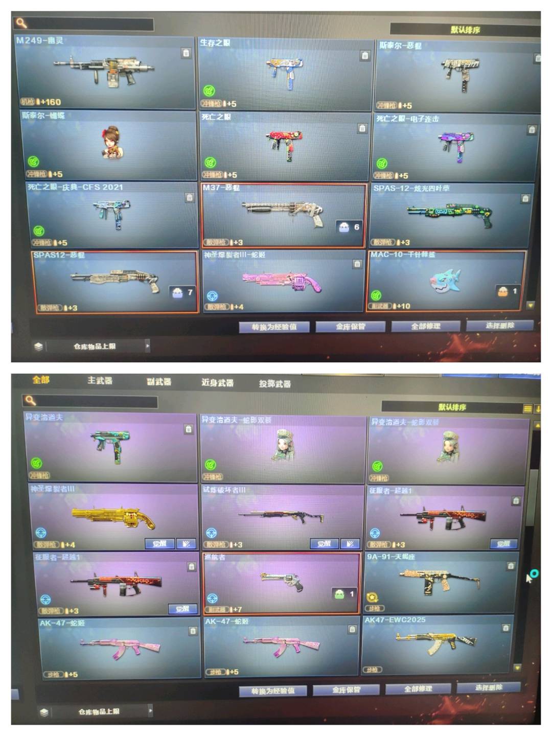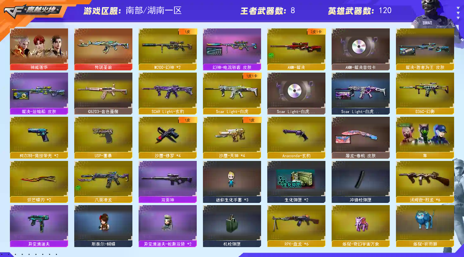 爆破4防云悠悠|幻神带皮肤|裁决带音效|白虎|王者星霆|各种弹夹等等 生化4防隼|八面玲珑|2泡泡象|炽芒蝶刃|6盘6烈|2清道夫小人枪|蝴蝶小人枪|小人枪秦师|各种猎手皮肤|各种终结者皮肤|各种生化雷等等道具 挑战高伤害号|探险843攻击|168套装|任何挑战图随便通关;USP-雷暴,炽芒蝶刃,隼,电竞教官-云悠悠,RPK-盘龙,QBZ03-金色蔷薇,G36C-幻影,