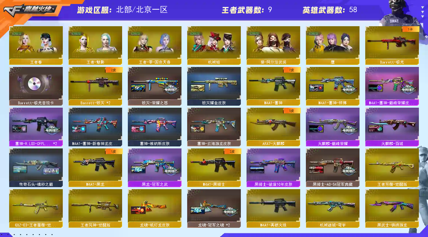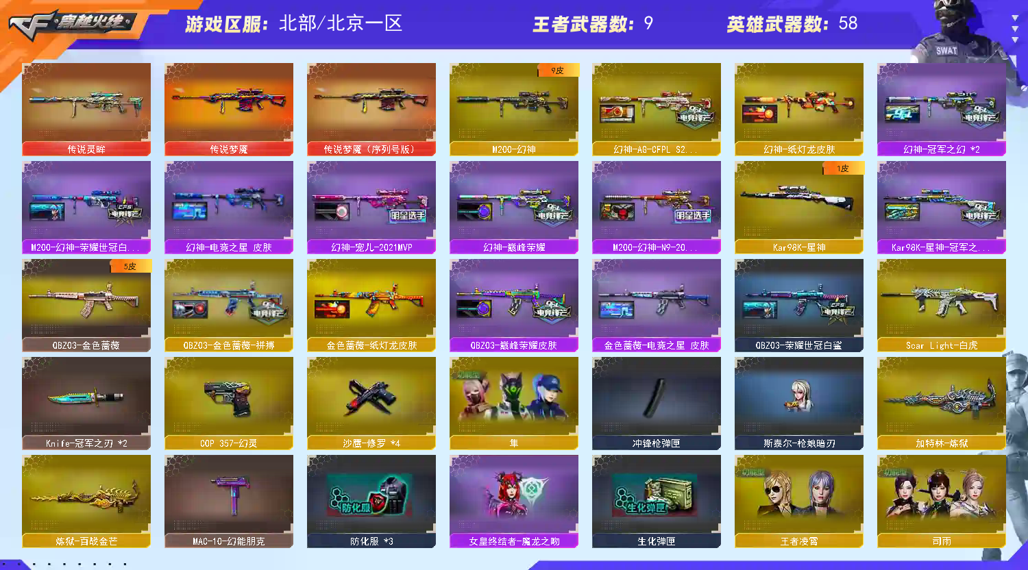 退排位拉黑;Knife-冠军之刃,隼,QBZ03-金色蔷薇,M200-幻神,Scar Light-白虎,传说灵眸,Kar98K-星神,