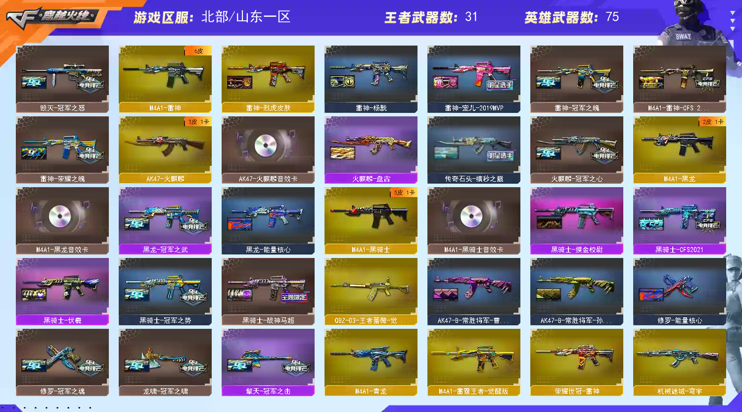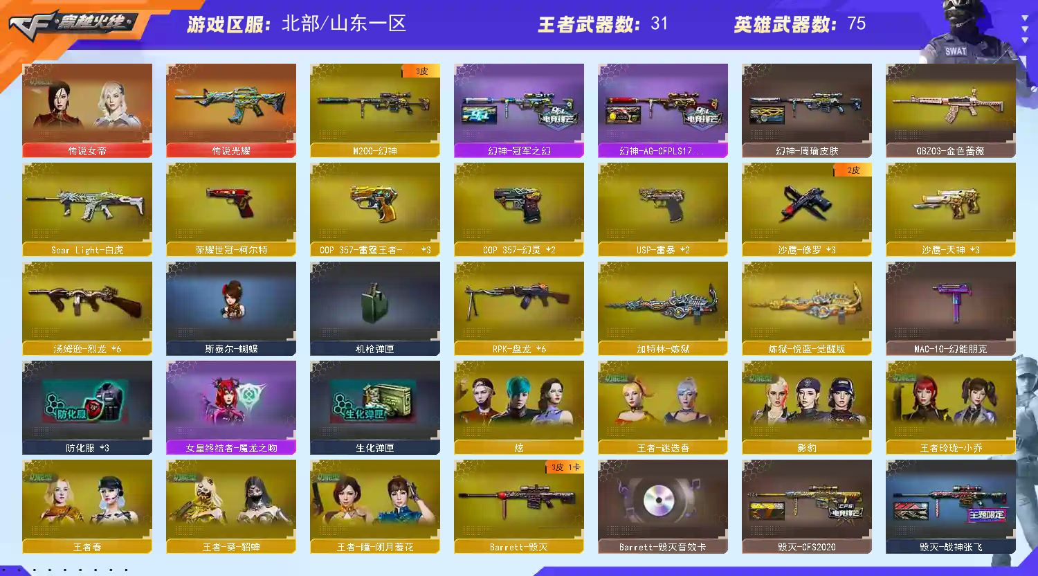 退排位拉黑;USP-雷暴,荣耀世冠-柯尔特,传说女帝,RPK-盘龙,QBZ03-金色蔷薇,M200-幻神,Scar Light-白虎,