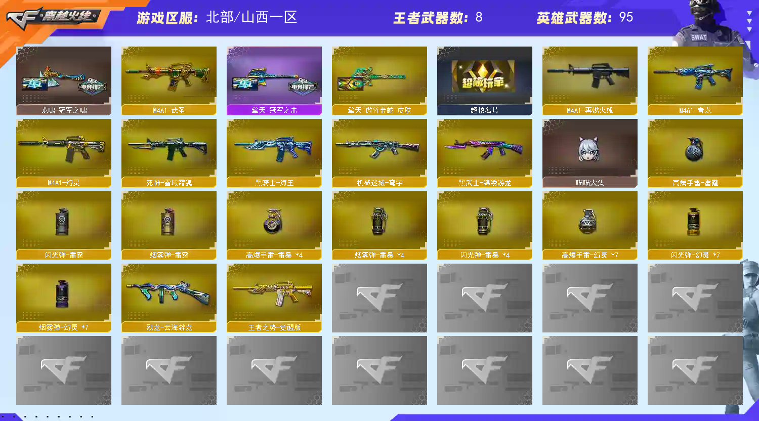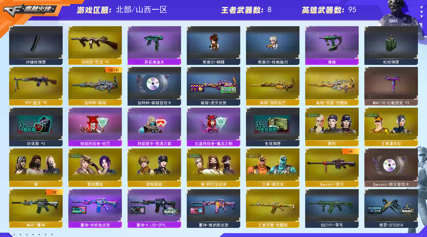 退排位拉黑;USP-雷暴,柯尔特-冠军之特,炽芒蝶刃,Knife-冠军之刃,隼,RPK-盘龙,QBZ03-金色蔷薇,