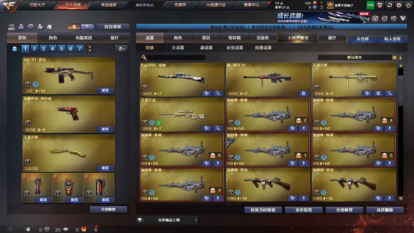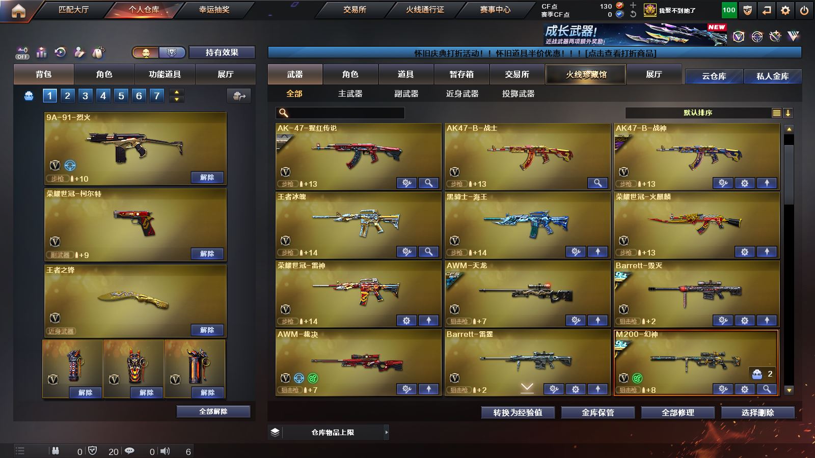 【M200幻神+冠军之幻皮肤】【98k星神+星神音效卡】【8六烈龙+6炼狱+死亡之眼】【白虎+霓虹机甲皮肤】【qbz03金色蔷薇】【荣耀世冠套装】【夜魔套装】【堕天神套装】【雷霆套装】【王者之心 王者之翼 王者之影 王者之鲨 王者冰魄 王者之戮 王者之魄 王者之武 王者之光 王者之决 王者之力 王者之怒】【火麒麟+火麒麟音效卡+冠军之心皮肤】【雷神+雷神音效卡】【黑骑士+黑骑士音效卡+冠军之势皮肤】【毁灭+毁灭音效卡+冠军之怒皮肤】【黑龙 无影 黑武士 天启 超新星 龙血 朱雀 无影神兵利器 黑武士锦绣游龙 超新星热带奇洋 9A91烈火 穹宇 猩红传说 战士 战神 黑骑士海王 天龙 源毁灭IV AA12雷霆】——【沙鹰修罗*5 沙鹰天神 cop357雷霆 cop堕天神 破空枪刃夜魔 王者之灵 荣耀世冠柯尔特】——【屠龙 龙啸 擎天 麒麟刺 尼泊尔雷霆 麒麟刺堕天神 龙啸堕天神 马来剑夜魔 龙啸热带奇洋 王者之锋 王者之击 荣耀世冠龙啸】——【雷霆投掷武器套装*7 堕天神投掷武器套装*6 夜魔投掷武器套装*7】——-【热门武器/小人枪】【青龙掌上穿越火线 炫金雷神 炫金骑士 炫金千变 炫金毁灭 巴雷特零水下丽影 CAT AWM灵狐15周年嘉年华】——【角色】【枪娘樱 王者葵貂蝉 王者潘多拉】【凌霄 迷迭香 炫 瞳】;荣耀世冠-柯尔特,QBZ03-金色蔷薇,M200-幻神,Scar Light-白虎,Kar98K-星神,