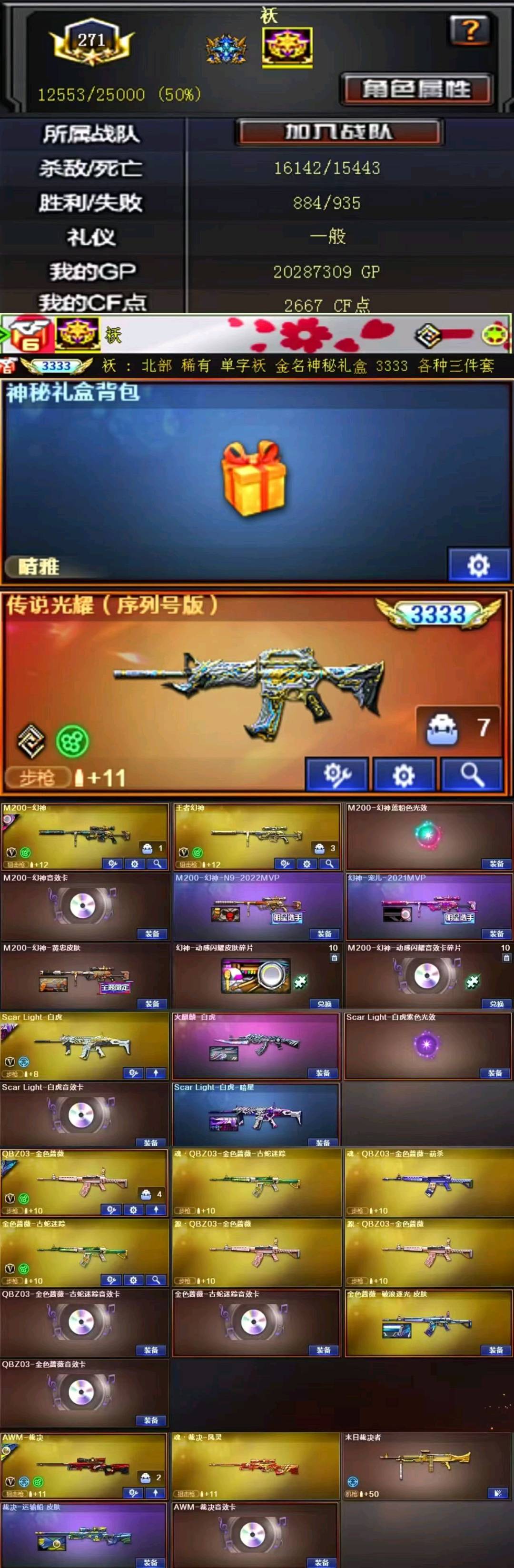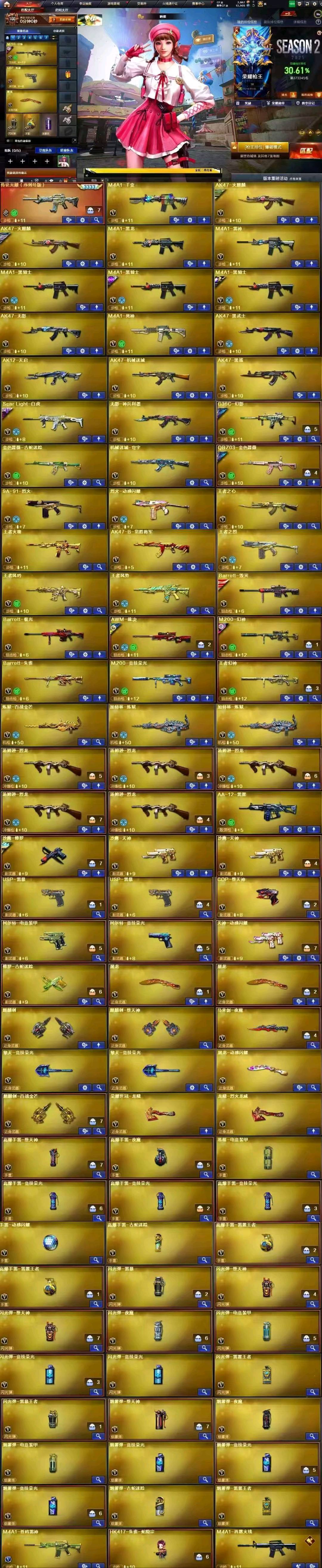 单字袄,序列号3333,幻神三件套,裁决三件套,白虎三件套,qbz三件套,排位退出拉黑。;USP-雷暴,电竞教官-云悠悠,晴雅,王者沙漠玫瑰,QBZ03-金色蔷薇,G36C-幻影,M200-幻神,