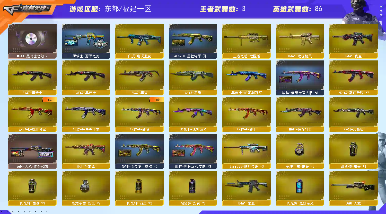 >>>>>>毁号,涉及毁坏虚拟财产罪及计算机安全罪,请文明游戏素质游戏,让我们共建美好租号平台>>>>>> 本游戏账号:英雄武器87个; 王者武器4个。 装备不多,但是主武器、副武器、近身武器够用 拥有完美游戏体验。重要的是,特殊装备有:M4A1-玫瑰精灵、加特林-炼狱、闪光弹-竞技荣光、麒麟刺、HK417-朱雀、荣耀世冠-龙啸、AK47-火麒麟、黑骑士-海王、M200-幻神、炫金毁灭、王者冰魄-觉醒版、王者之怒-觉醒版、炫金武士、魅影、堕天使、M4A1-雷神音效卡、M4A1-黑骑士音效卡、生化弹匣、M200-幻神音效卡、等,随意畅选。 注意事项: A.游戏过程中请不要恶意挂机或者不文明发言 B.恶意挂机、顶号等行为将被拉黑无法再次下单 C.进入游戏后中途请勿退出登陆,否则无法再次上号 D.部分账号由于异地登录可能会出现密码错误提示,通常再尝试5-6次后可上号 |||||||||喜欢本账号请点 ☆收藏☆ 方便下次租用,谢谢光临惠顾|||||||||;RPK-盘龙,QBZ03-金色蔷薇,M200-幻神,