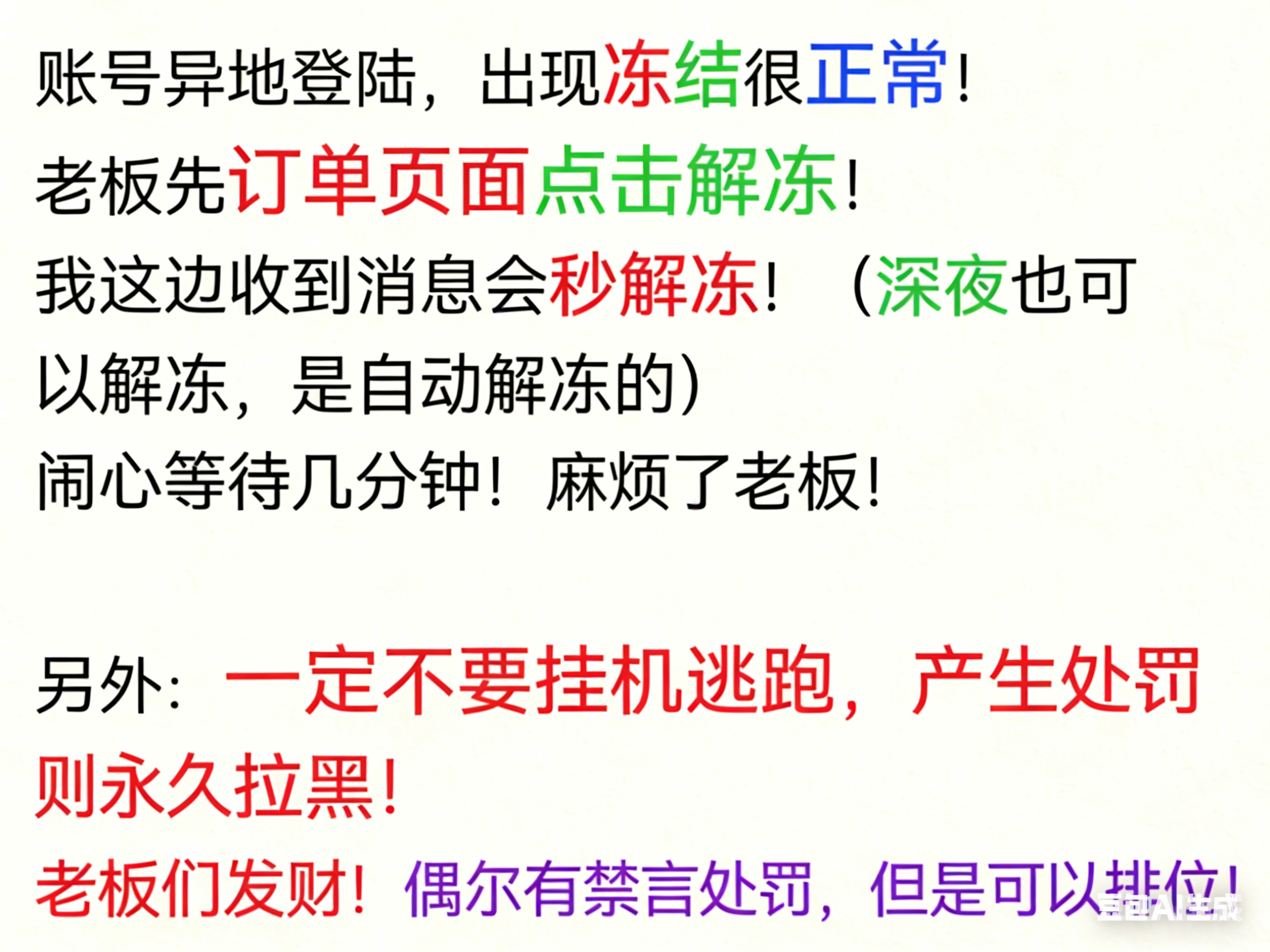 禁止炸鱼 谢谢 禁止炸鱼 谢谢 太容易封号 谢谢了大佬们 出现游戏冻结先关闭游戏客户端,并在登号客户端订单页中找到该笔订单点击【解除冻结】后,我会在一分钟内解除冻结,再次点击开始游戏即可 订单结束时有几率发生掉线情况,因为订单钥匙失效,后面都连不上了,为了您的游戏体验建议进行续租。 !!!!使用向日葵、todesk等远程软件。罗技等相关软件,会视为风险程序,直接完结订单,请各位老板关闭相关程序后再启动上号器!!! 1.请勿使用第三方软件/插件/外挂,平台检测到会直接完单。 2.登陆界面稍等2分钟会上去(自动登录)老板不要着急,一次不行多来几次wegame界面要耐心等2分钟 3.密令会自动输入如果一次不成功多来几次 4.请及时续租不要挂机,到时不下线,但是下一个会挤号导致挂机,所以请及时续租,导致禁赛的一律拉黑 5.祝老板玩的愉快,喜欢可以收藏关注 !开挂必追究,不拿到赔偿不罢休! 如果上号正在游戏中,是上个租客到时不下线导致的,不是顶号,请帮忙打完这局,谢谢了。 时间到了建议续租,打完撤单,为了防止顶号,请您及时续租获得更好的游戏体验 禁止炸鱼 禁止炸鱼 禁止炸鱼 禁止炸鱼 禁止炸鱼 禁止炸鱼 禁止炸鱼 谢谢 谢谢 -----R点建议升级新套装;紫金爪刀,剥皮小刀,归零者 獠犬,盖亚的复仇 狂徒,洪荒怒焰 狂徒,掠影 狂徒,侦察力量 幻影,