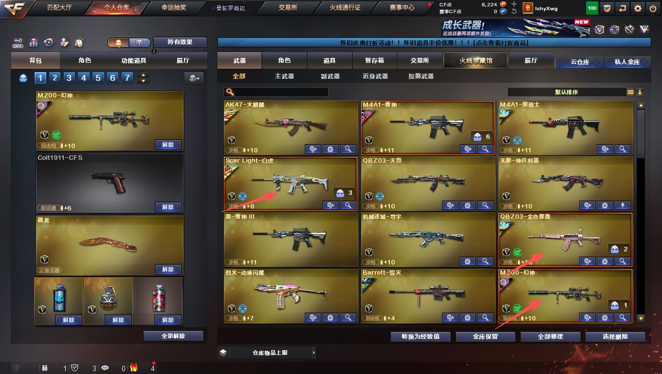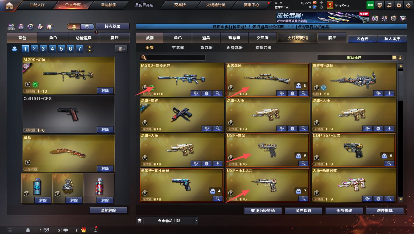 【白虎3件套 幻神3质量皮!!!】【m200幻神+宠儿皮肤+ags24冠军皮肤+荣耀世冠白鲨皮肤+冠军之特+冠军之刃】【m200竞技荣光套装+usp雷暴+电竞教官云悠悠】【王者星神+usp神工天巧】【白虎+白虎音效卡+sgs20冠军皮肤】【qbz03金色蔷薇+冠军之薇皮肤+ags19冠军皮肤】【雷神+宠儿皮肤】【毁灭+荣耀之怒皮肤】【黑骑士+冠军之势皮肤】【火麒麟 雷神 黑骑士 天罚 无影神兵利器 机械迷城穹宇 烈火动感闪耀 毁灭】——【热门武器/小人枪】【黄金猫猫手套白鲨】【冠军之特 usp雷暴 usp神工天巧 cop幻灵 柯尔特竞技荣光 修罗 天神 天神动感闪耀】【屠龙 麒麟刺 龙啸 擎天竞技荣光 屠龙动感闪耀 龙啸烈火龙威】——【幻灵投掷套装*2】【竞技荣光投掷套装*2】——【角色】【4防电竞教官云悠悠 隼】【乔伊教练】;USP-雷暴,柯尔特-冠军之特,Knife-冠军之刃,隼,电竞教官-云悠悠,QBZ03-金色蔷薇,M200-幻神,