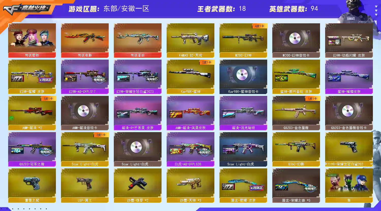 双传说极品♥幻神三件套♥星神三件套♥裁决三件套♥qbz白虎三件套♥极光霹雳满质量手枪♥喜欢的老板收藏哦;柯尔特-荣耀世冠白鲨2023,炽芒蝶刃,传说星骇,隼,晴雅,QBZ03-金色蔷薇,G36C-幻影,
