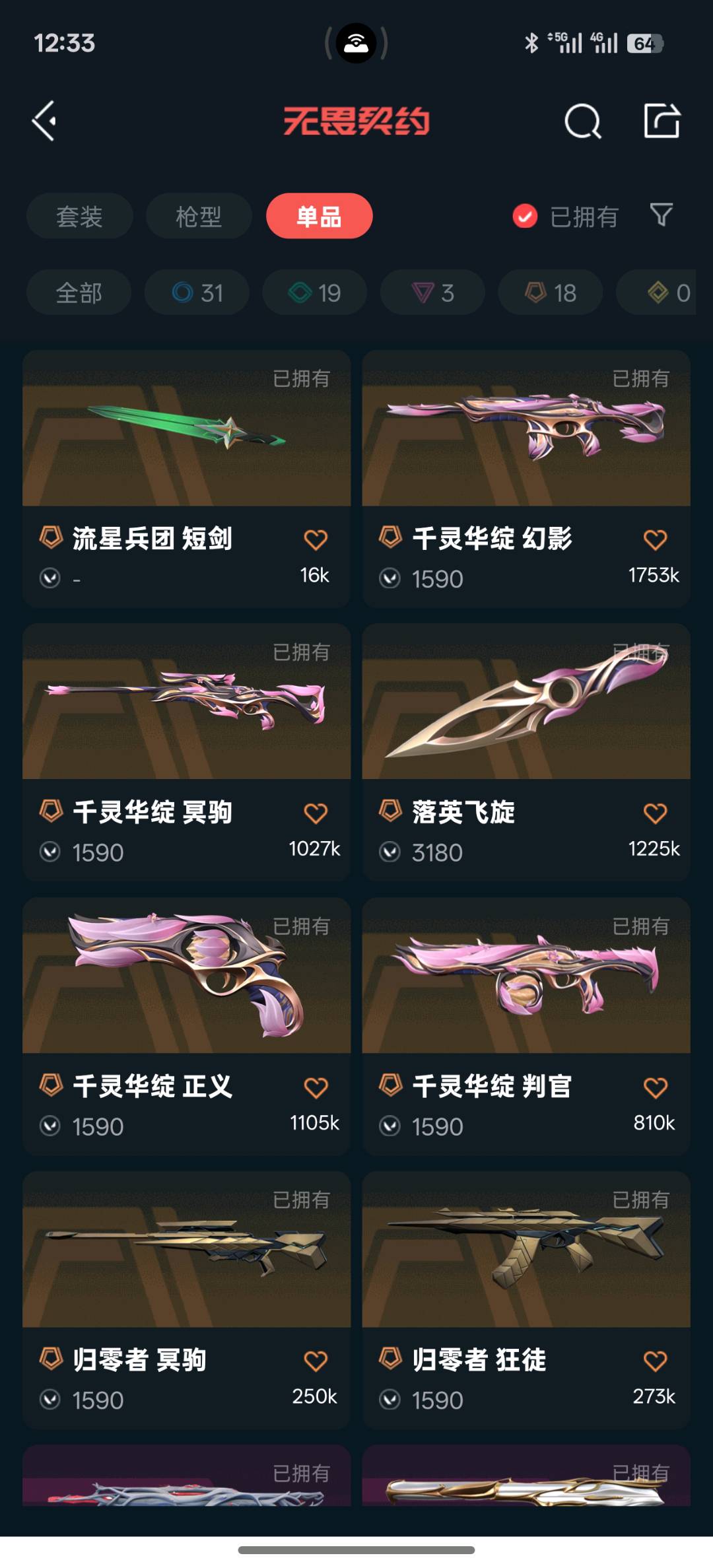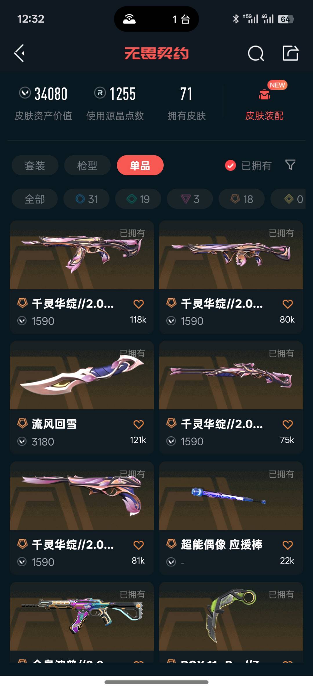 套装:千灵华绽套装|千灵华绽2.0套装 千灵华绽套装:千灵华绽幻影V4|千灵华绽判官V4|千灵华绽冥驹V4|千灵华绽正义V4|落英飞旋V2| 千灵华绽套2.0套装:千灵华绽狂徒V4|千灵华绽鬼魅V4|千灵华绽莽侠V4|千灵华绽战神V4|流风回雪V2| 莲花套装:莲花狂徒V4|莲花幻影V4|莲花鬼魅V4|莲花正义V4|莲花莽侠V4|莲花冥驹V4|莲花判官V4|莲花扇子V2| 显卡3.0套装:显卡正义V5|显卡莽侠V5|显卡爪刀V2| 其他皮肤:全息波普狂徒V4|盖亚的复仇狂徒V4|归零者狂徒V4|超能偶像狂徒|流星兵团狂徒|弧光异彩狂徒|诡秘蛇影狂徒|聚合之力幻影|末日之翼幻影|彩梦之城戍卫|超能偶像戍卫|战术熊与伙伴们戍卫|折光棱晶戍卫|弧光异彩獠犬|采蜜小蜂队獠犬|信手涂鸦骇灵|流星兵团骇灵|弧光异彩蜂刺|纤云弄巧蜂刺|聚合之力蜂刺|折光棱晶蜂刺|采蜜小蜂队判官|超能偶像判官|诡秘蛇影判官|彩梦之城雄鹿|归零者冥驹V4|诡秘蛇影莽侠|纤云弄巧莽侠|战术熊与伙伴们莽侠|盖亚的复仇V4飞将|信手涂鸦飞将|末日之翼飞将|聚合之力飞将|信手涂鸦奥丁|末日之翼奥丁|流星兵团奥丁|采蜜小蜂队战神|超限闪存正义|纤云弄巧正义|星云暗涌鬼魅|信手涂鸦鬼魅|流星兵团鬼魅|天界神兵鬼魅V4|采蜜小蜂队鬼魅|战术熊与伙伴们狂怒|聚合之力狂怒|纤云弄巧短炮|末日之翼短炮|超能偶像标配|战术熊与伙伴们标配|折光棱晶标配|彩梦之城标配|超能偶像应援棒|流星兵团短剑;